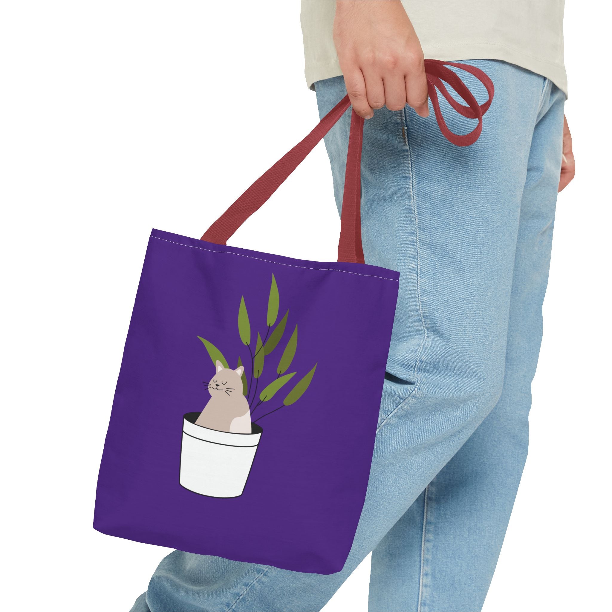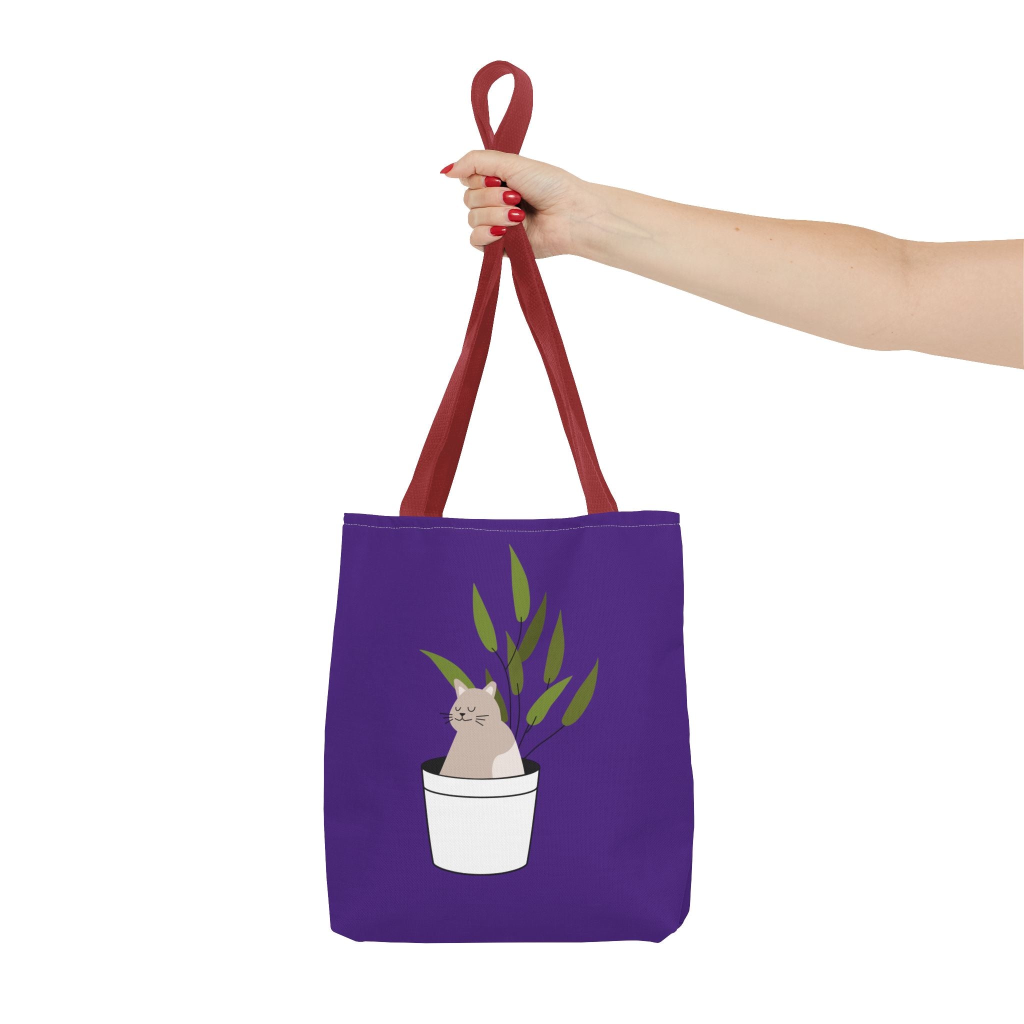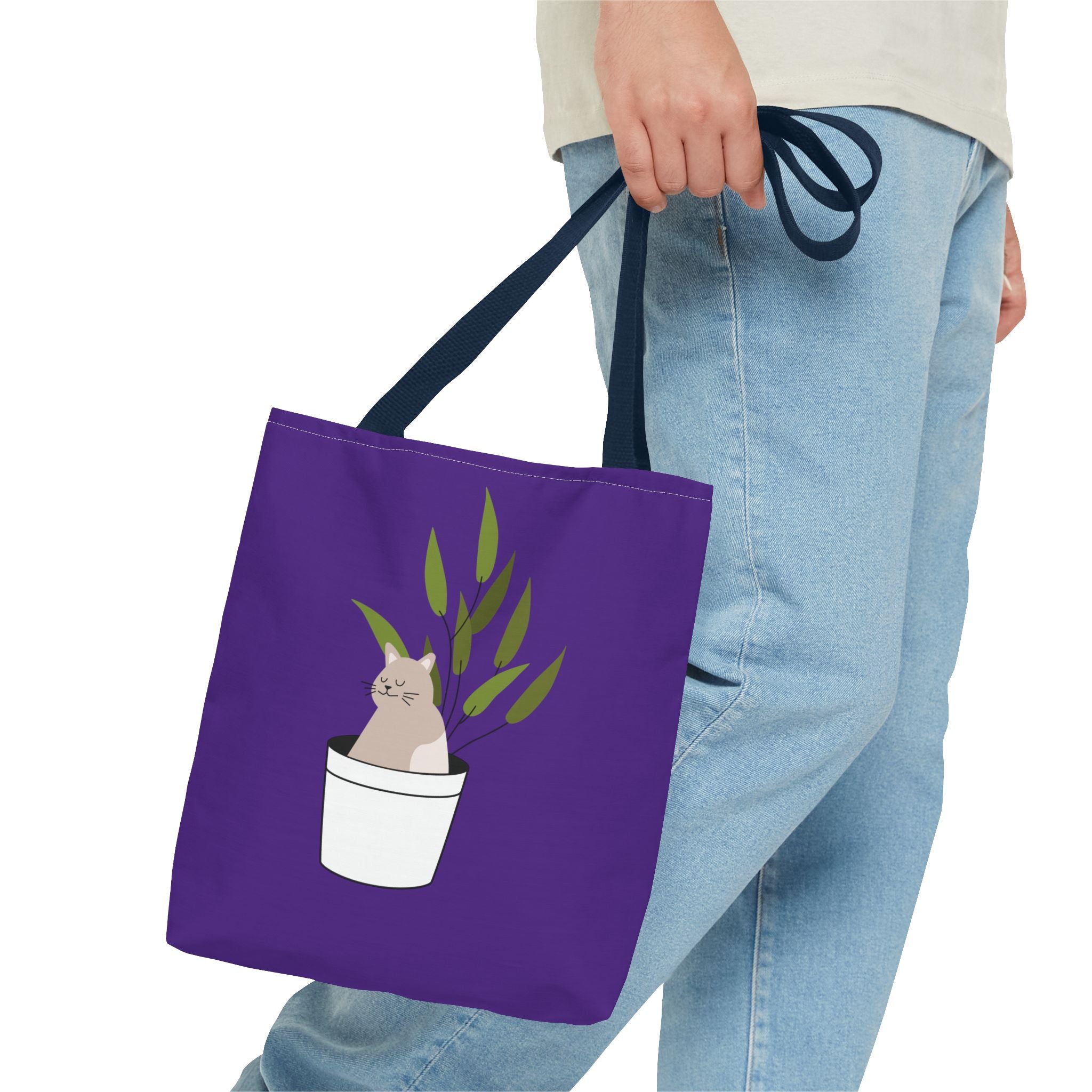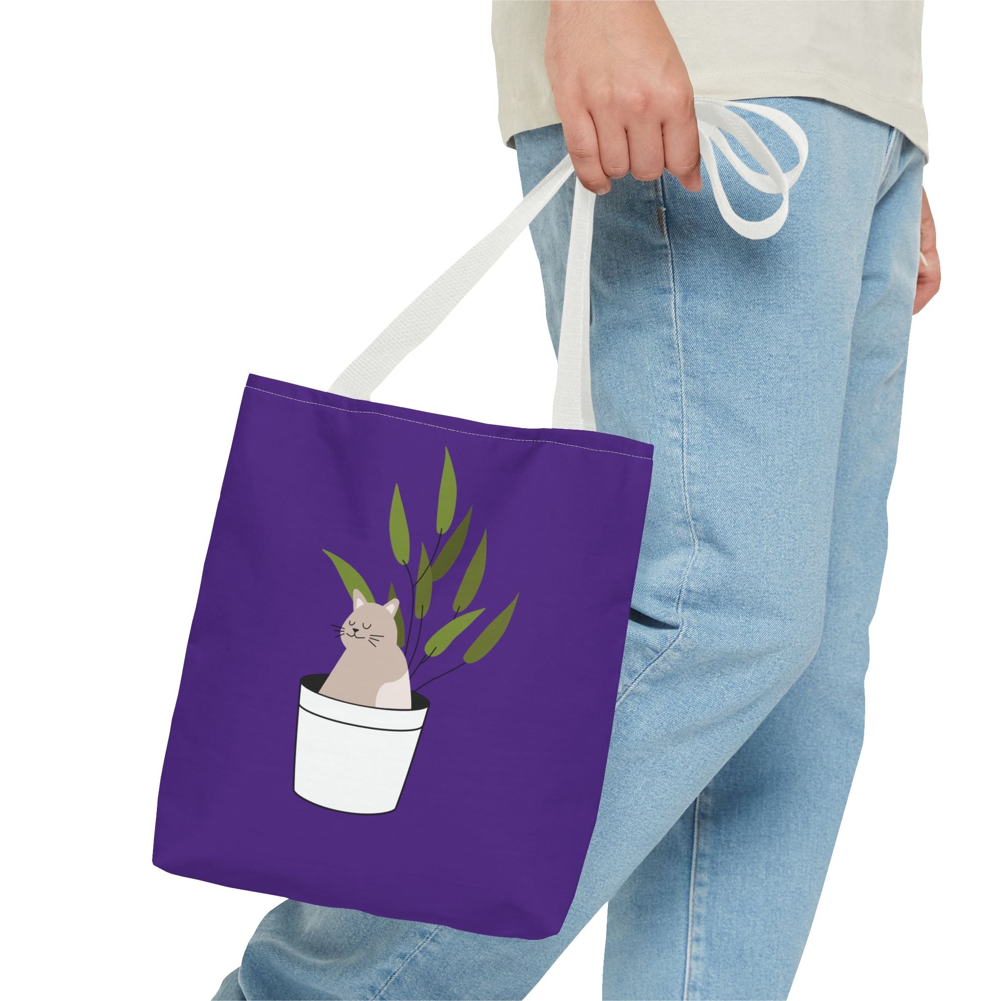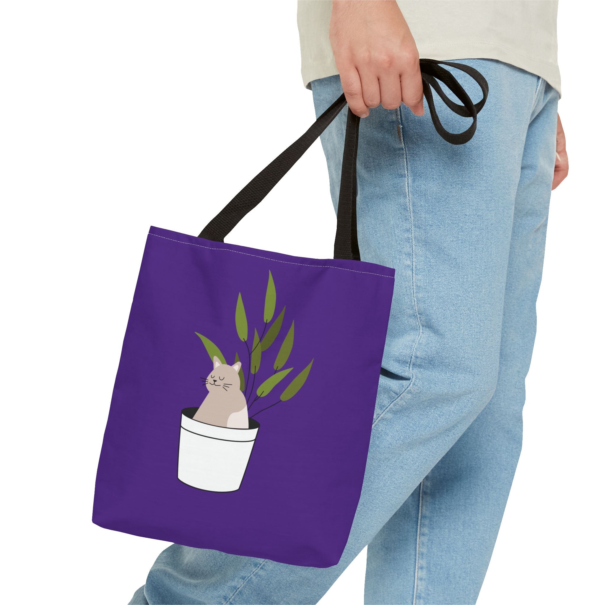 Cute Cat in Plant Tote Bag - Purple Floral Eco-Friendly Bag for Cat Lovers