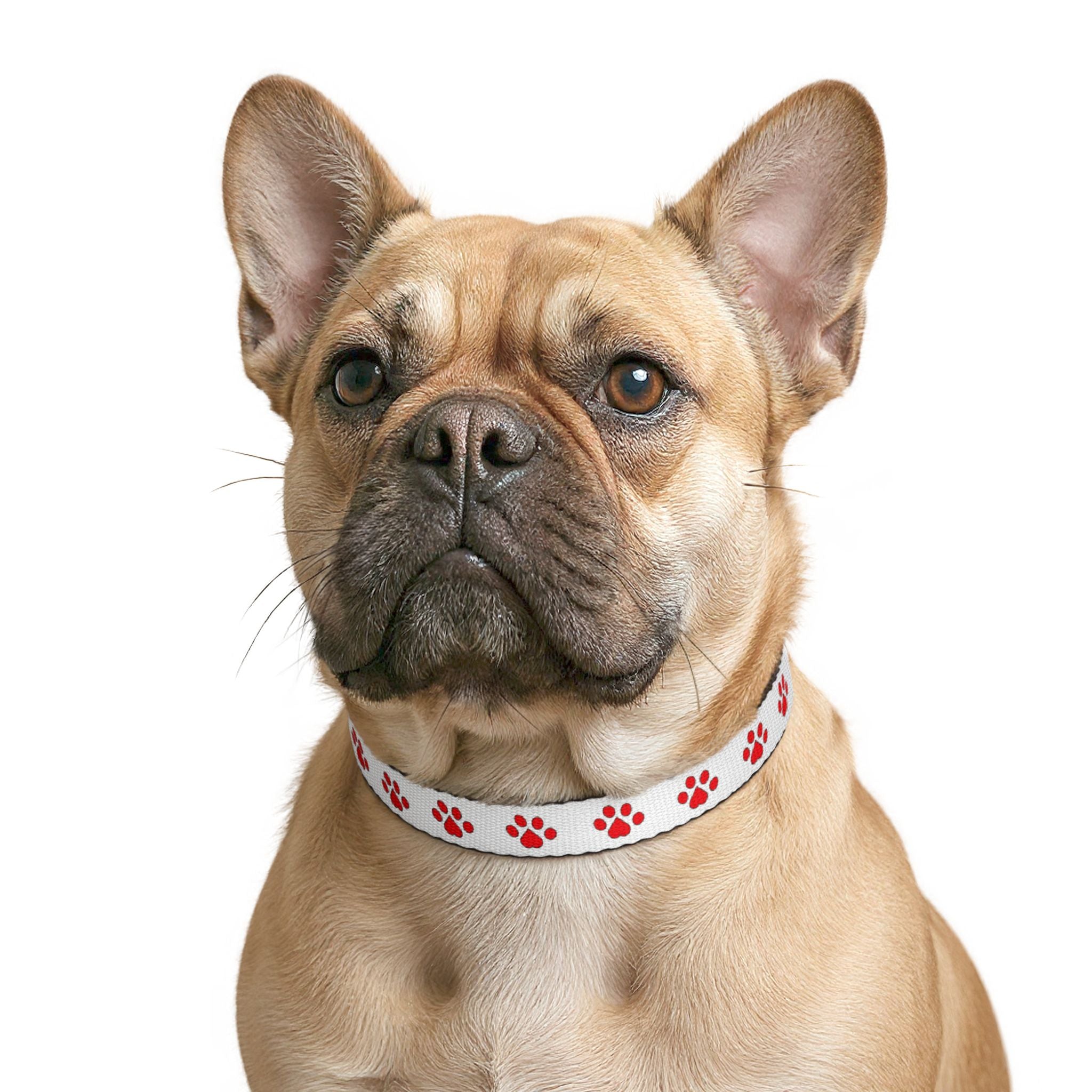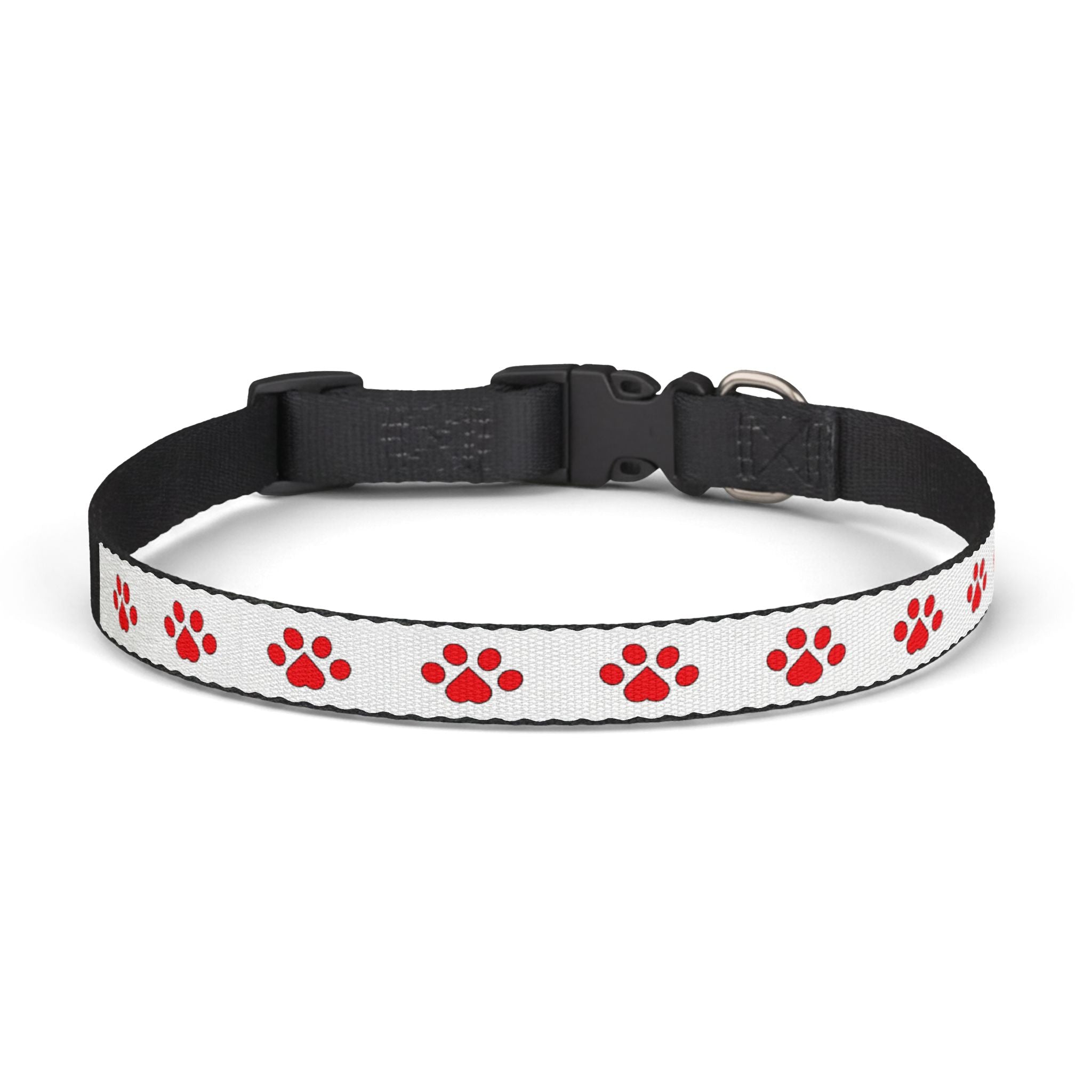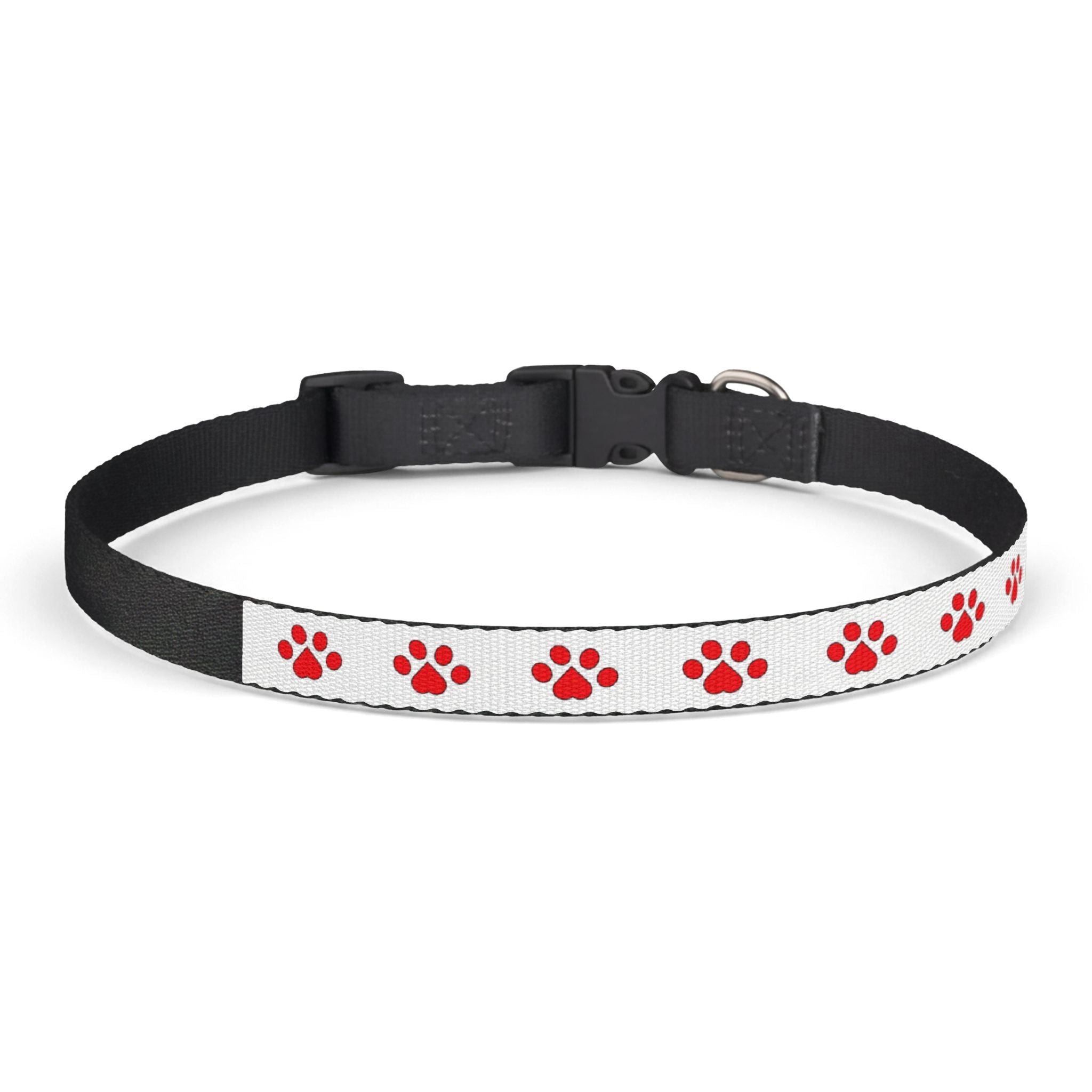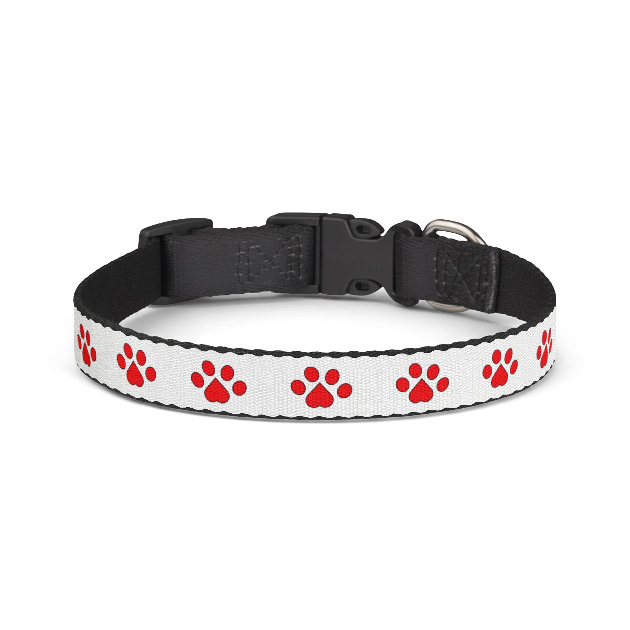 A sturdy clip-on pet collar patterned with bright red paw prints that brings a playful pop to everyday walks. The collar’s strong polyester fabric and heavy-duty black nylon webbing stand up to tugging and outdoor messes while keeping the print visible and cheerful. Lightweight yet durable, it slips on quickly with a secure clip and sits comfortably on small to medium pets. Imagine morning strolls with that little flash of red by your dog’s neck — a familiar, friendly mark that matches wagging tails and neighborhood adventures. Works well for walkers who value durability and simple, bold style during regular outings, vet visits, and casual meetups at the park.