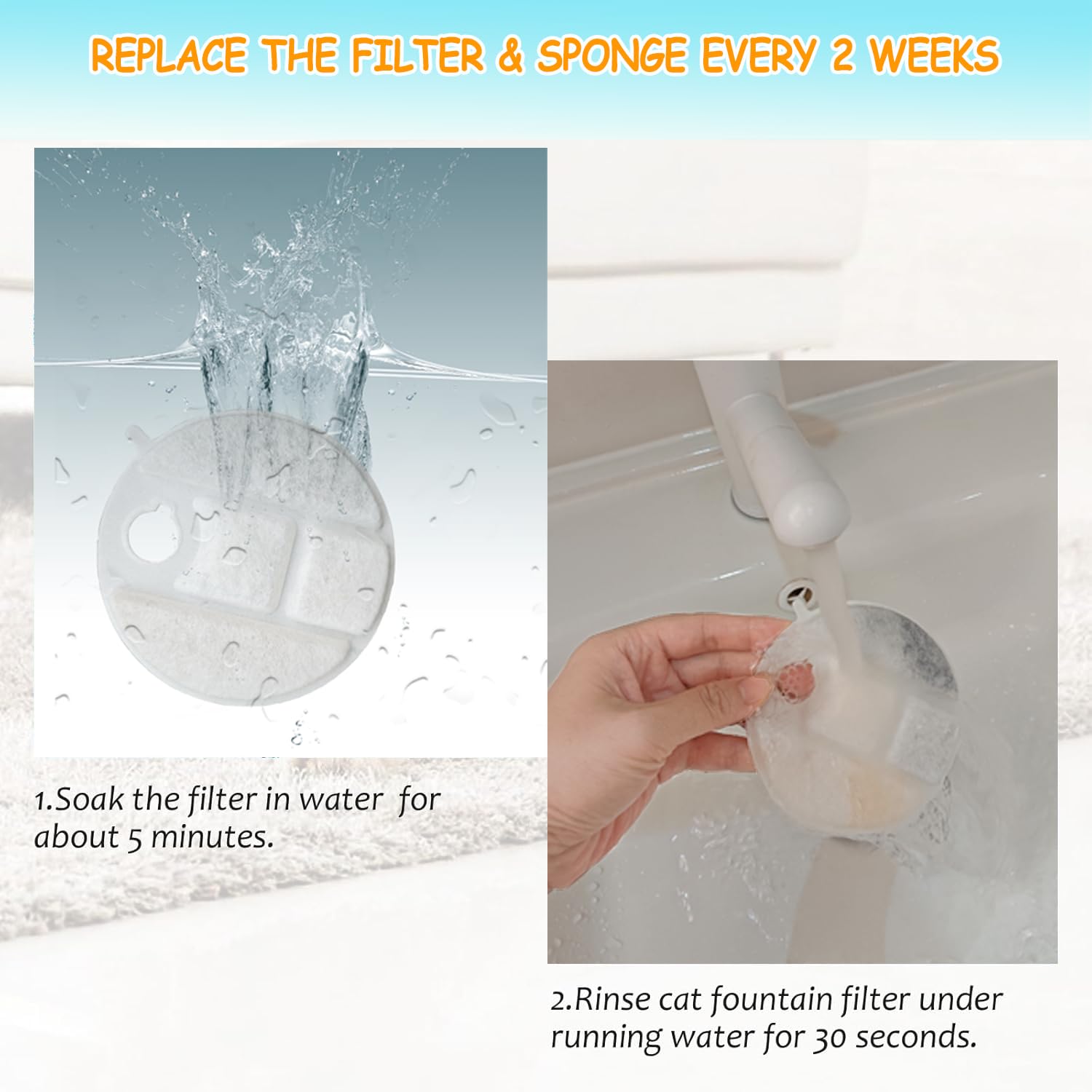 - 【Warm Tips】In order to prevent activated carbon dust from falling into the water, soak the filter replacement in water for 5 minutes and rinse for 30 seconds with clean water before use.