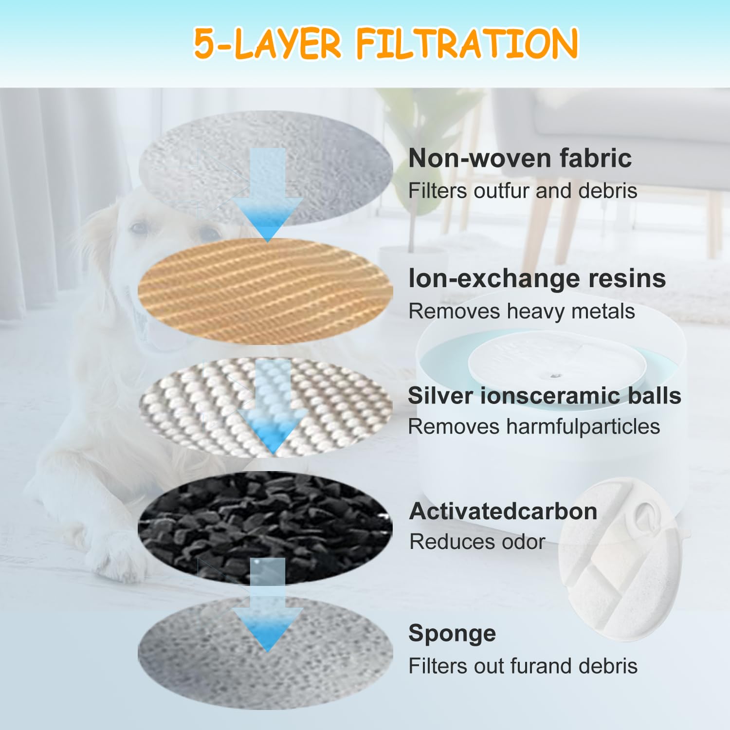 - 【5-layer Filtration System】 The petlibro filter features Activated carbon(eliminates foul odors), Ion-exchange resin(filters heavy metals, softens water quality), Non-wovens fabric( isolating cat hair, food residue), Silver ion ceramic balls( remove harmful particles), built-in pump sponge (further filters debris to prevent blockages and damage.ensure your pets can drink clean and fresh water all day.
