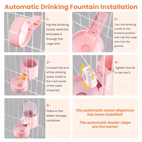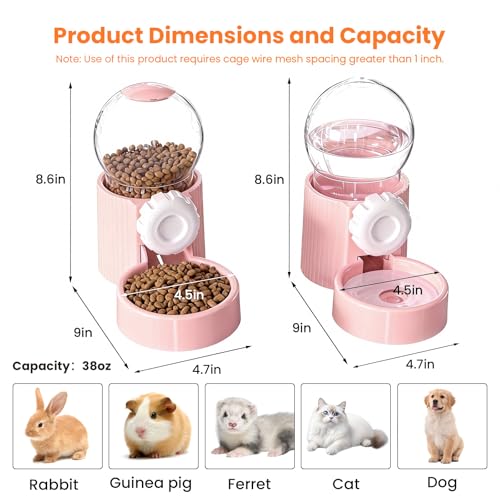 38oz Hanging Automatic Food Water Dispenser, Large Capacity Gravity Rabbit Water Dispenser and Feeder Set, for Bunny Guinea Pig Chinchilla Ferret Cage Accessories (Pink)