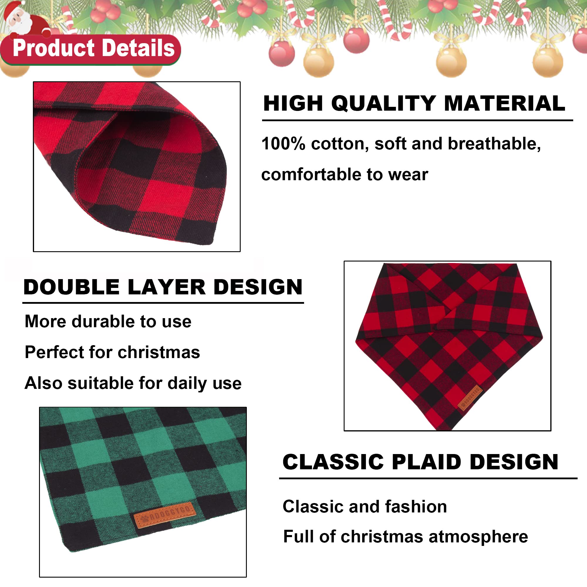 - Christmas Dog Bandanas: Classic plaid design, christmas style red green color, full of christmas atmosphere, fashion and never out of date, make your dog look attractive and unique on christmas day.