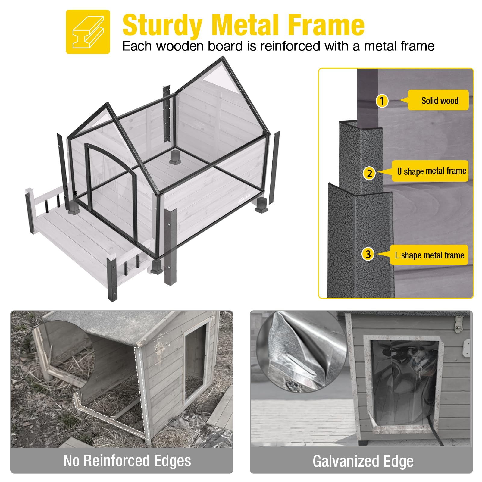 - Sturdy metal frame: All panels of the dog house are reinforced with a sturdy metal frame and connected by L-shaped metal rods for unmatched durability to withstand extreme weather and unexpected impacts, ensuring the safety of pets outdoors