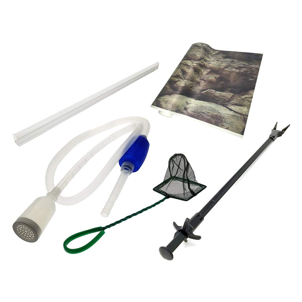- ACCESSORIES INCLUDED - Includes all the mounting brackets and hardware you need along with a submersible multi-stage aquarium filter with bio-media and charcoal filtration, siphon cleaner, grabber tongs, fish net, multiple marine background, custom fit lid and energy efficient LED light fixture