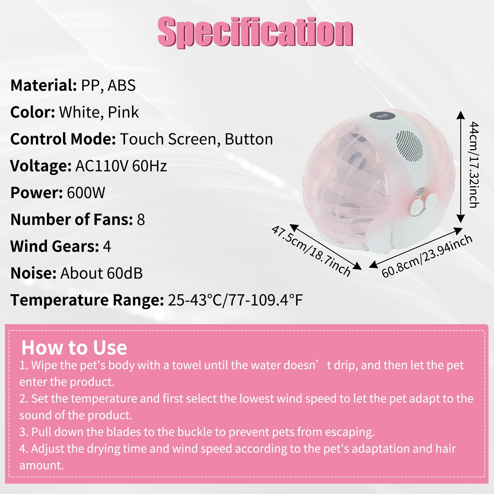 - 【Quick Drying】: The internal 8 fans in different directions can achieve 360° drying, combined with hot air and strong power (600W), which can quickly dry pet hair, resulting in higher efficiency.