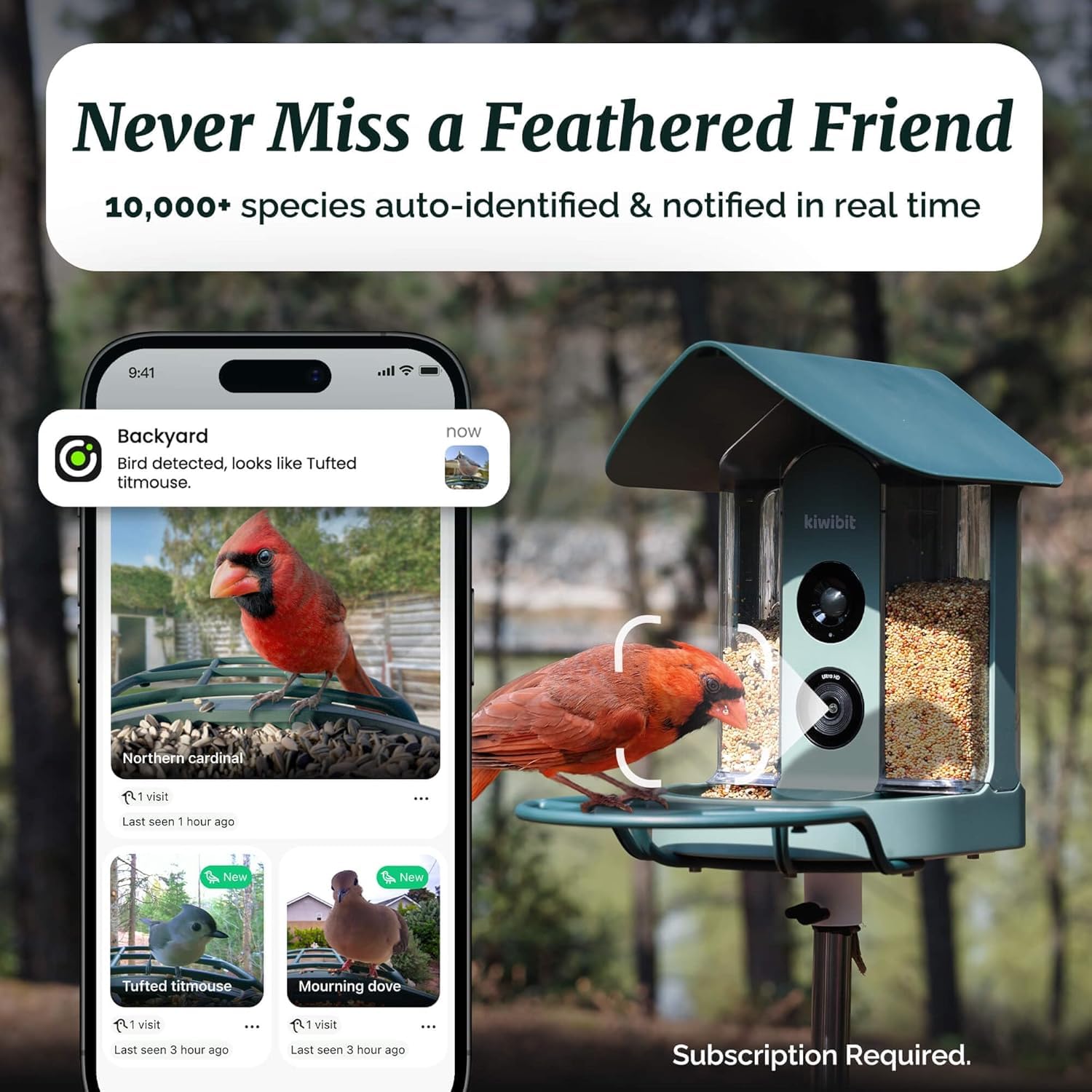 - ADVANCED AI FEATURE - Enjoy stunning 4K live streams and recordings with no subscription required. Watch birds in real time and share their visits freely. For bird lovers who want deeper insights, Advanced AI identify over 10,000 bird species and captures moments and organizes them by species for easy viewing and sharing bird keyshot. Advanced AI features by subscription.