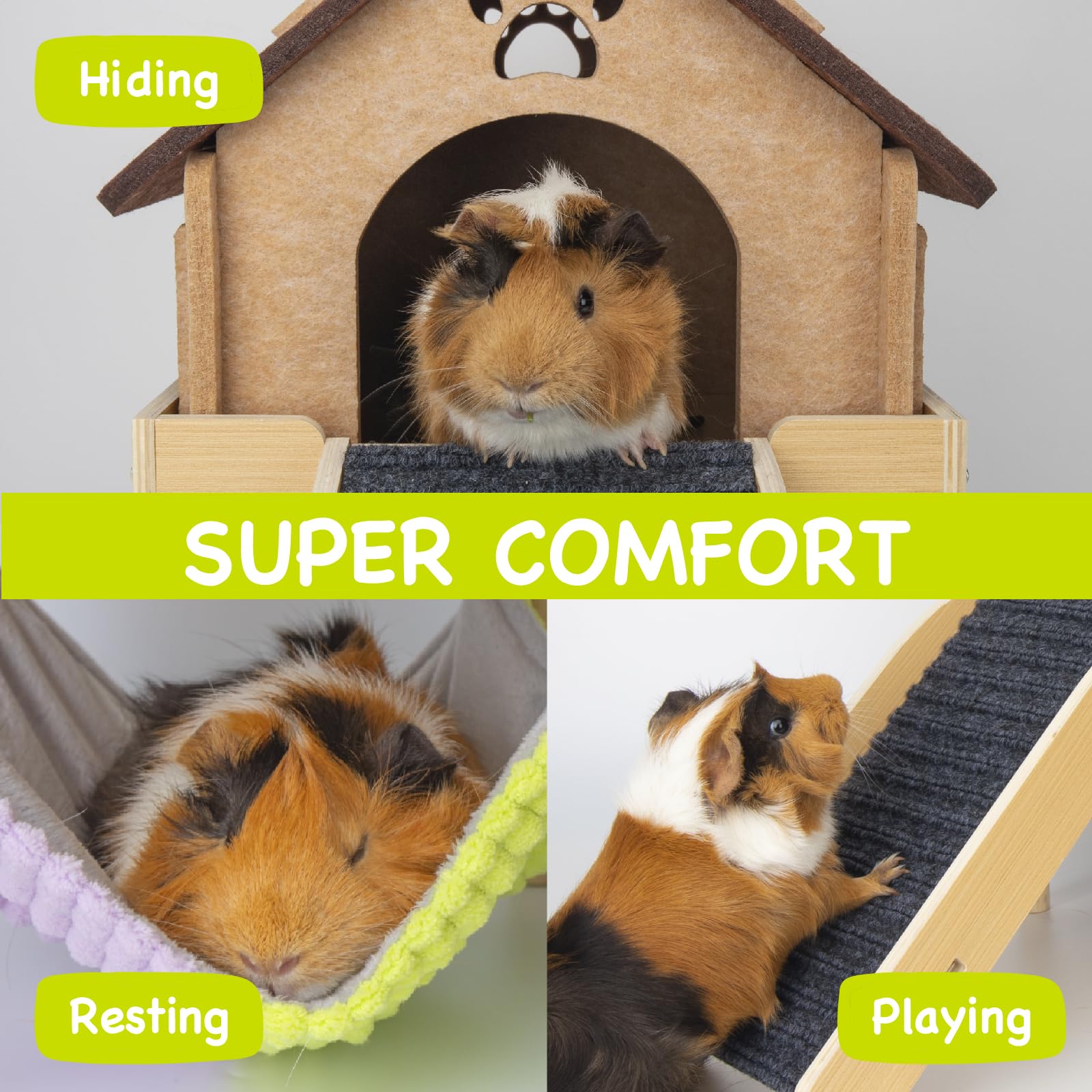 - 【3 IN 1 MULTIFUNCTIONAL DESIGN】Hammock+Platform+House.This guinea pig toys uniquely combines a hammock,platform and house together to provide your piggies with multiple ways to move around.The perfect blend of hiding,sleeping and playing can promote a happy and healthy lifestyle for your piggy.Effectively saves the space in guinea pig cage and cost of guinea pig accessories.