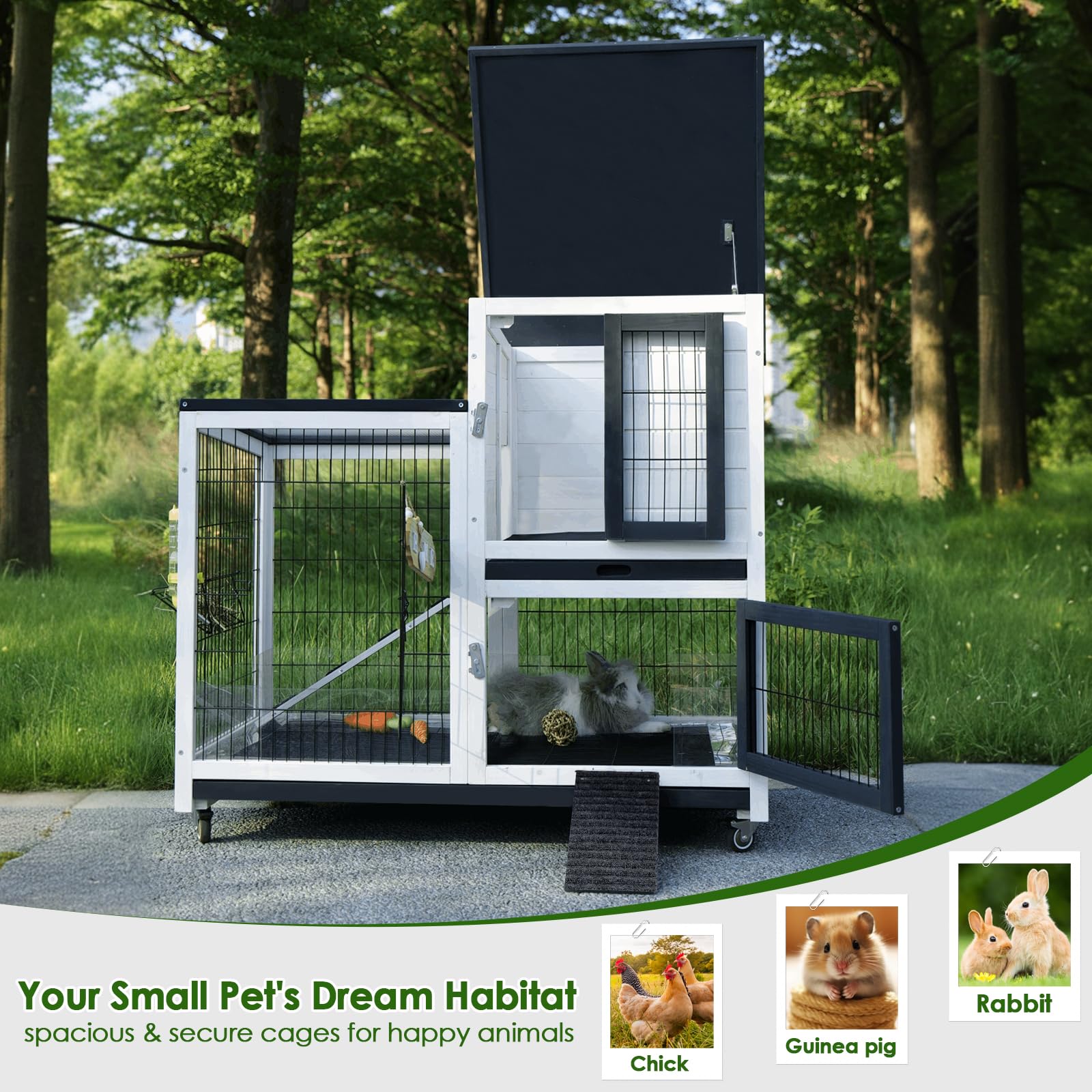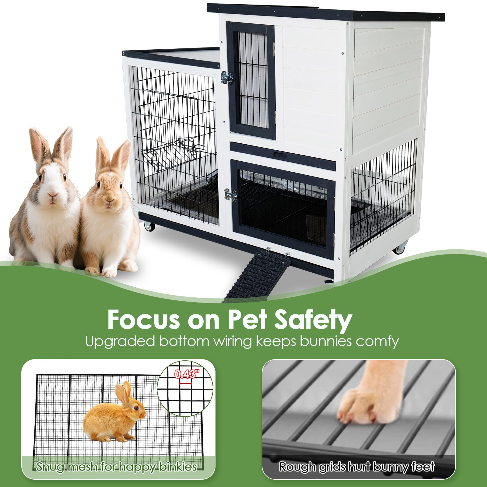 - All-Weather Mobility:Move your bunny hutch effortlessly with 4 heavy-duty wheels (2 lockable). Perfect for transitioning between indoor bunny enclosures and outdoor play areas. The drainage system with dual channels keeps pets dry even during rainstorms