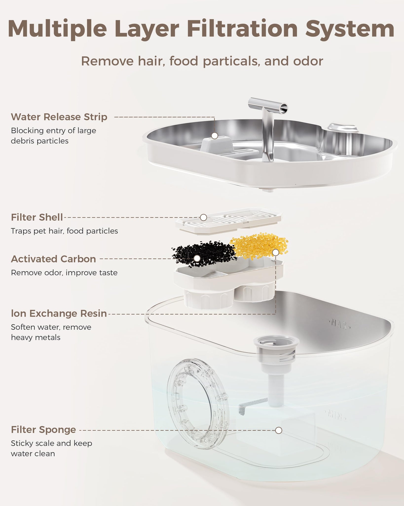 - Quadruple Filtration System: Cat water fountain boasts a state-of-the-art quadruple filtration system, including an activated carbon filter with a cotton layer and activated carbon. This powerful system effectively eliminates odors and softens water, while the filter sponge traps pet hair, dirt, and food particles, delivering pure and refreshing water to your furry friend