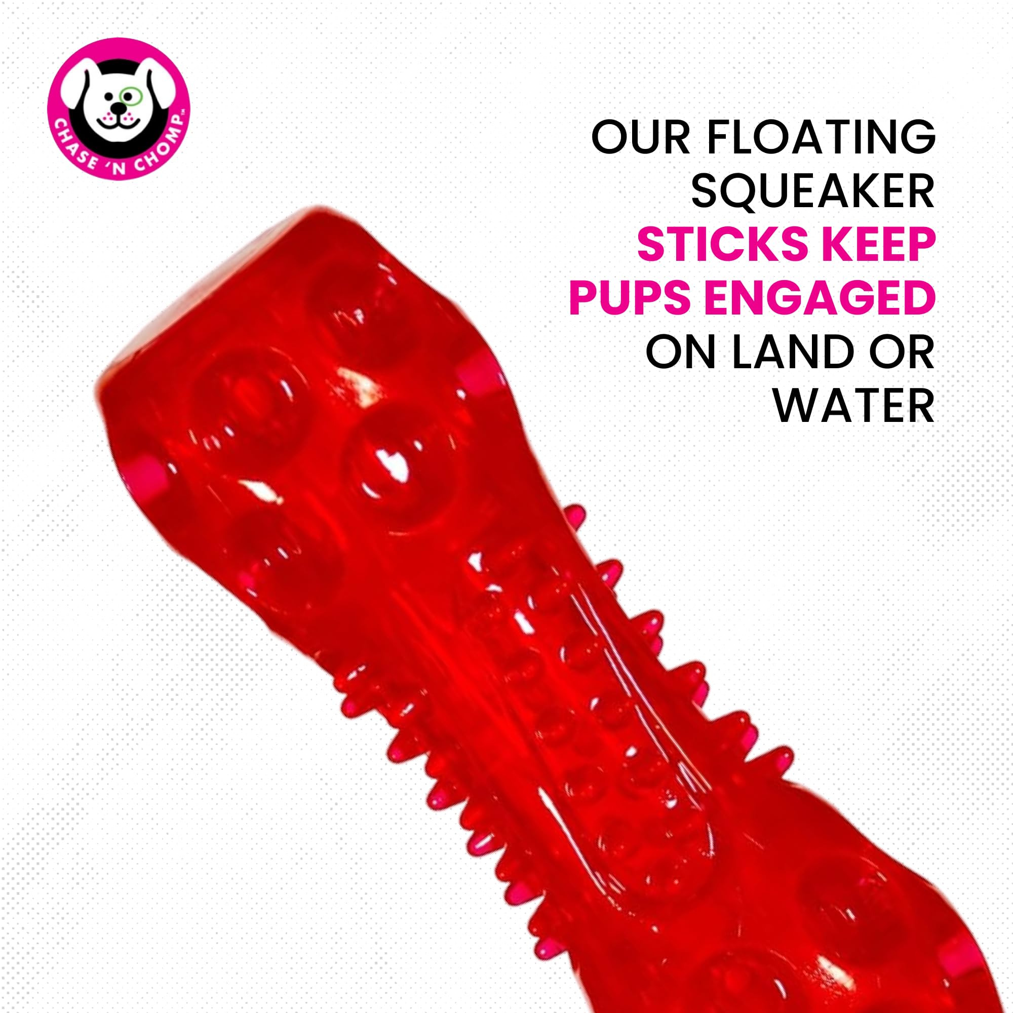 - FOR ALL DOGS: The squeaker stick is for dogs of all shapes and sizes, water-loving or land-loving! The squeak will keep your dog engaged and if you happen to have a water loving dog, the stick floats in the water -- giving your dog endless fun!