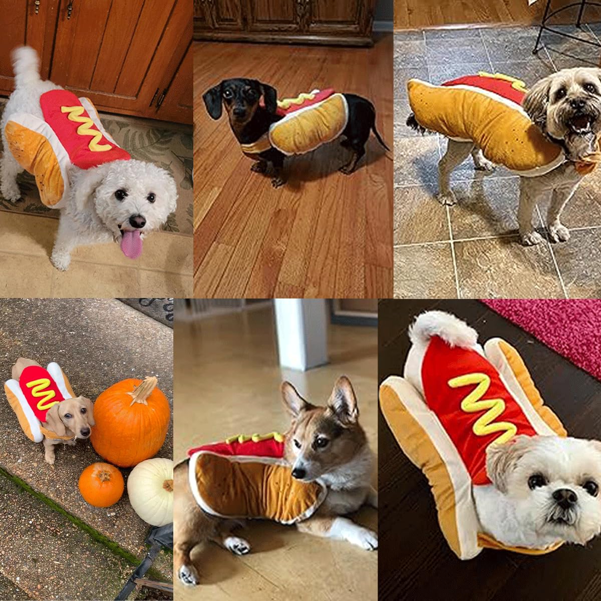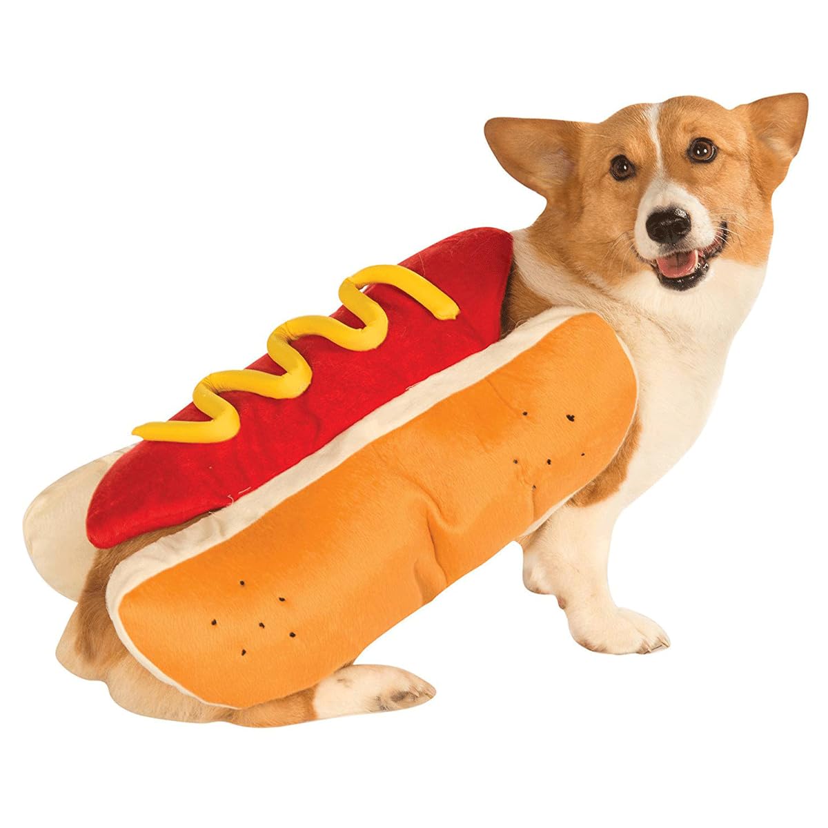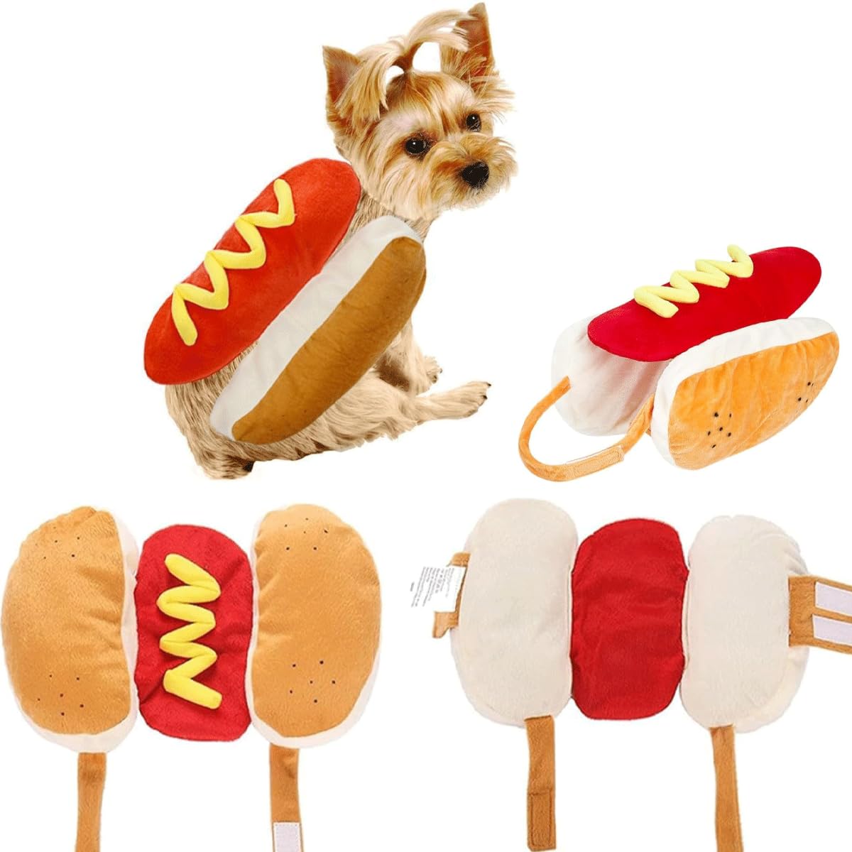 - 【 Unique Hot Dog Design 】Hot dog costume for dog features plush soft pullover body suit in the shape of hot dog with mustard and bun,with this hot dog pet suit, your puppy or cat will instantly transform into a hot dog, making your furry friend look like a delicious snack. Not only can you enjoy your own treats, but you can also watch your pet prance around in this hot dog look.