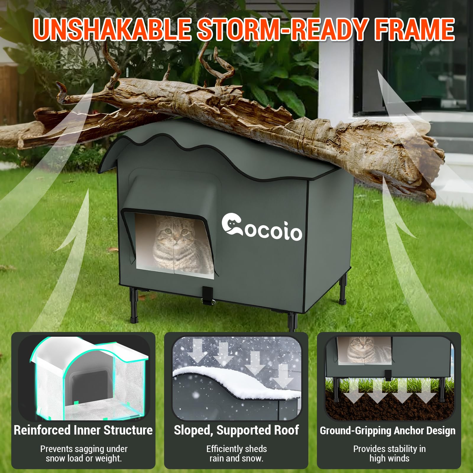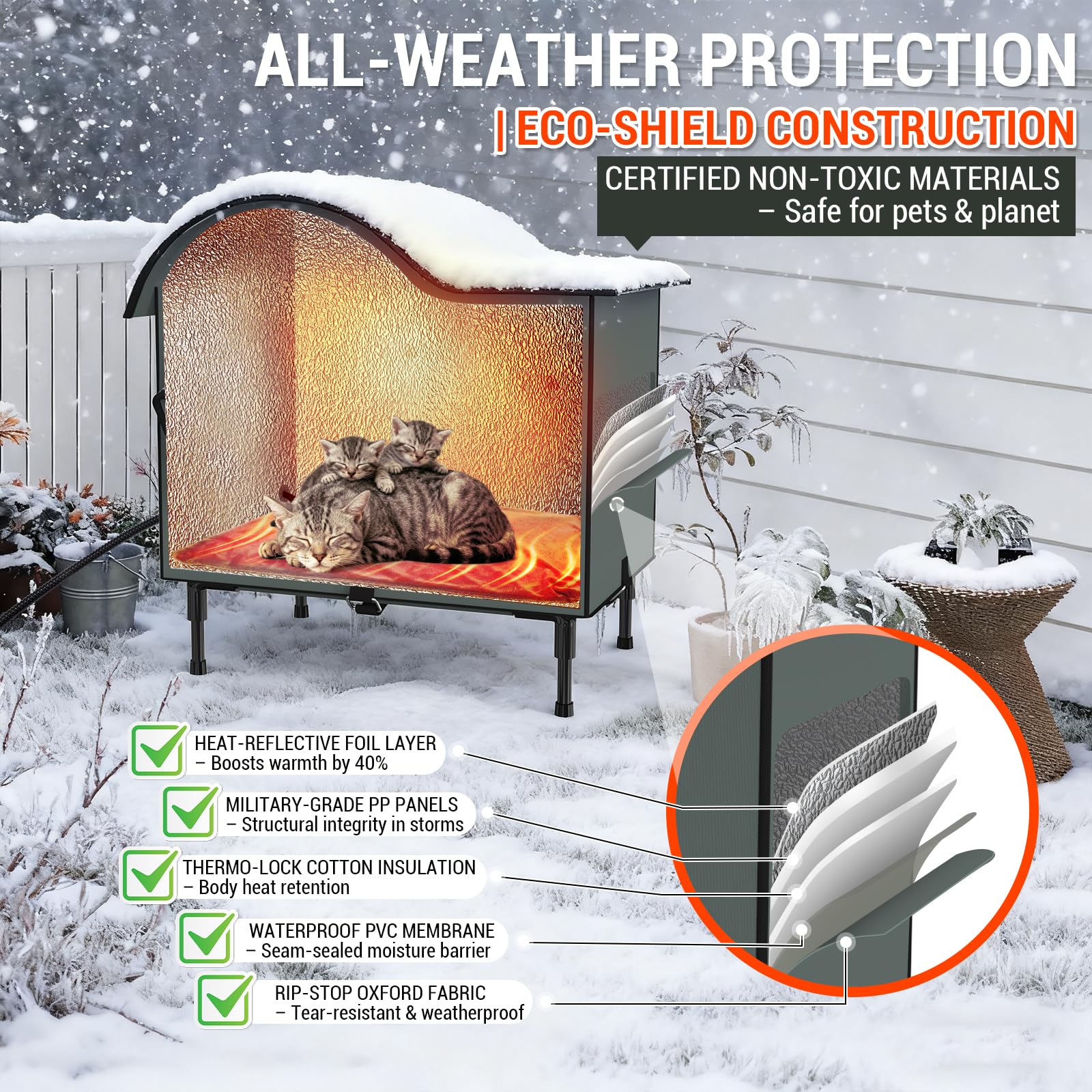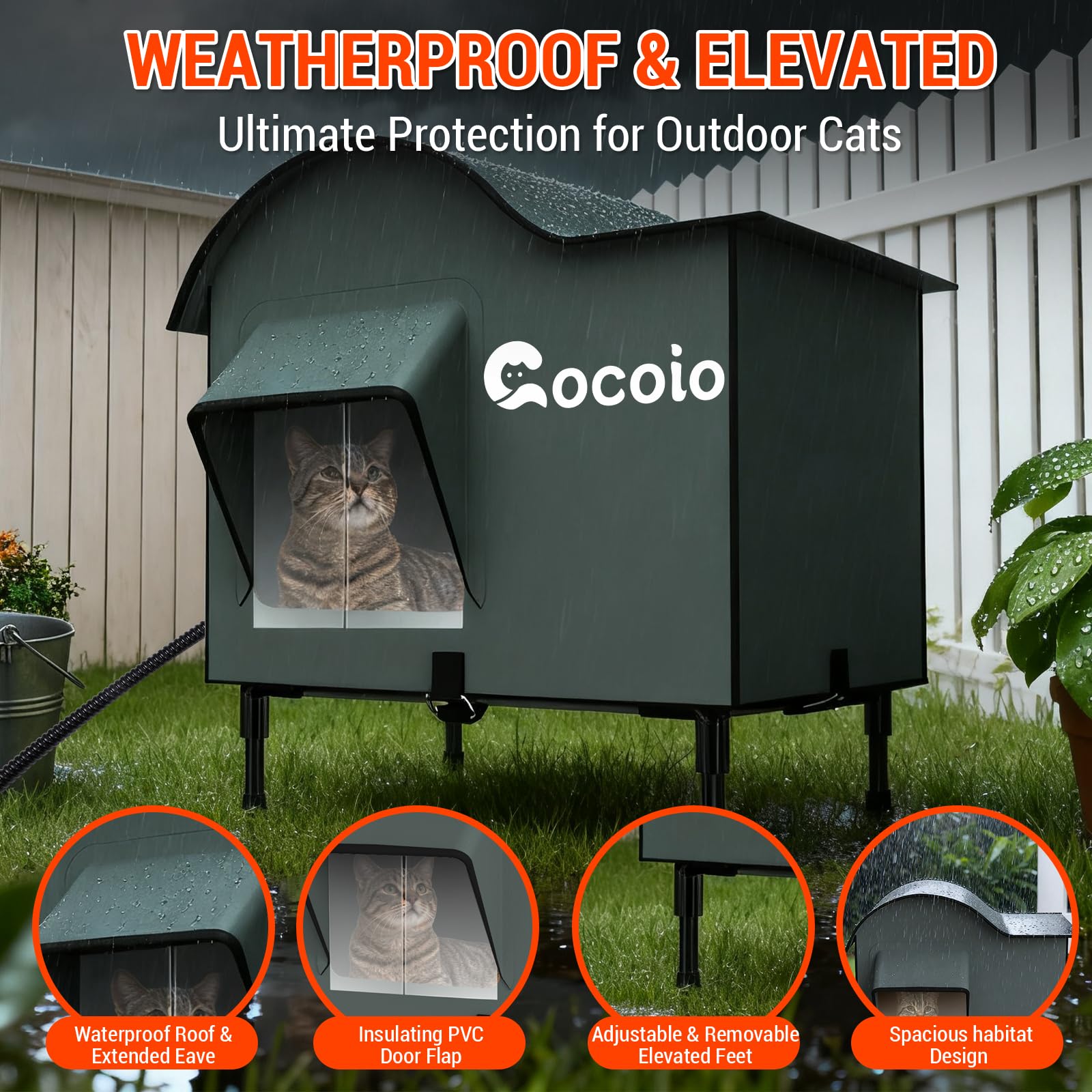 - 【360° Stormproof & Elevated Shelters】Stop worrying about wet ground damage! Our elevated heated outdoor cat house sits 5 inches off the earth, armored with military-grade 900D Oxford fabric + PVC-reinforced base. Deep eaves + sealed seams create true 360° waterproof defense against rain, snow, and mud – keeping your cat’s den bone-dry while locking in warmth