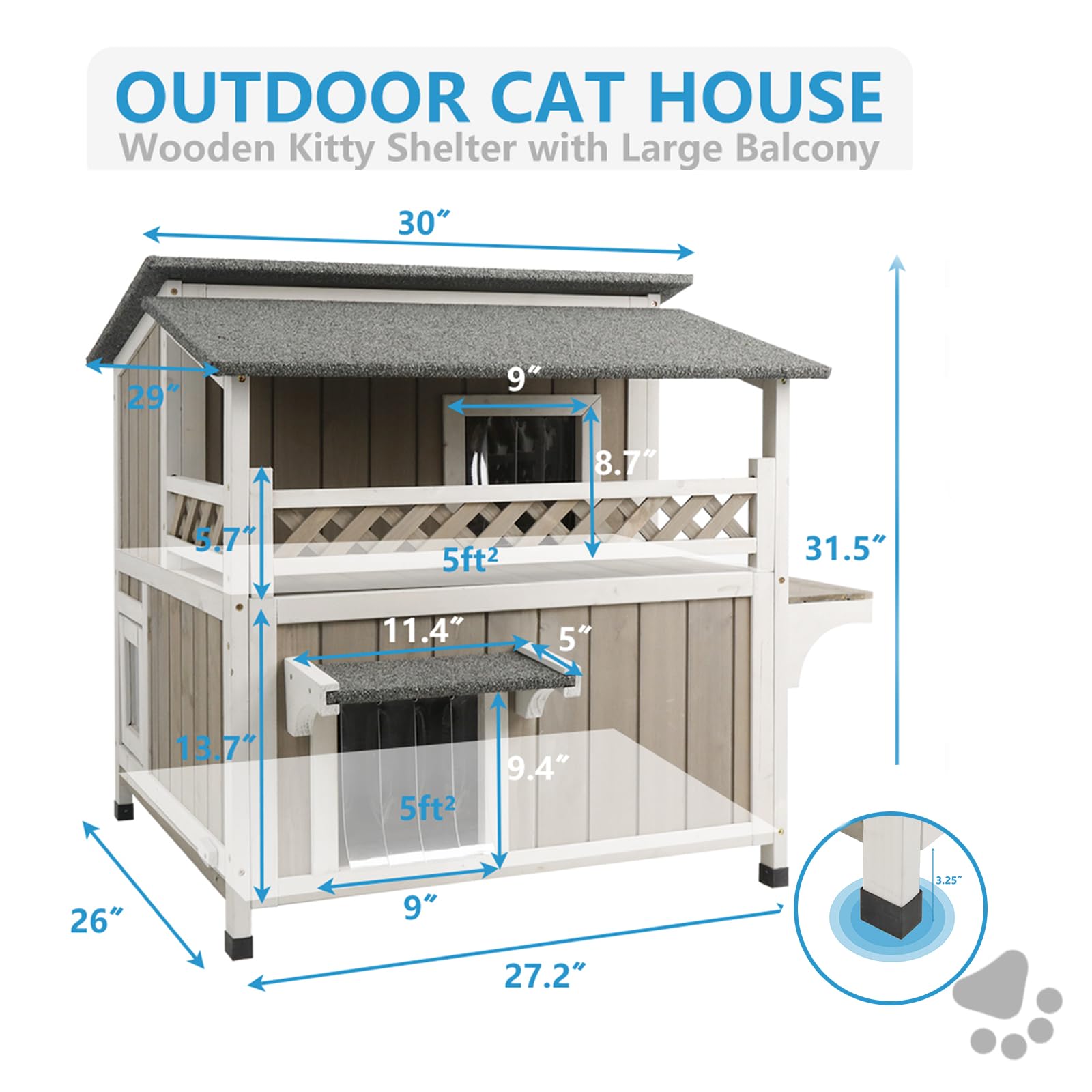 - OUTDOOR CAT HOUSE WITH BALCONY:Stand out from ordinary outdoor cat houses with this uniquely designed shelter!Based on our research into the habits of stray cats, we're confident they'll adore the upper large balcony.Here, the charm of aesthetics and the essence of practicality blend seamlessly, creating a cozy haven where stray cats can rest easy. It's not just a shelter; it's a heartfelt way for you to show your love and care.
