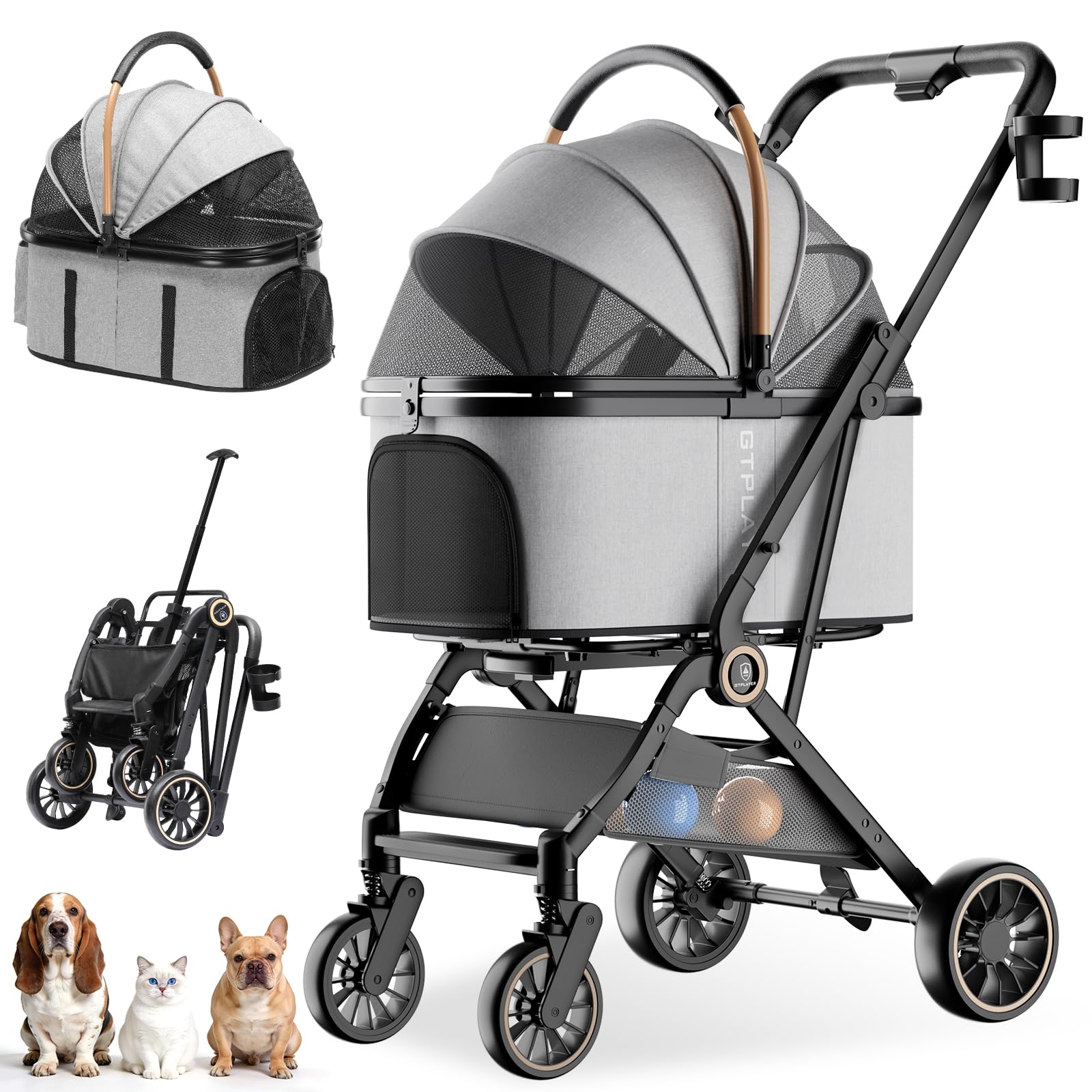GTPLAYER Pet Stroller for Small Dogs & Cats, 3-in-1 Foldable Pet Stroller with Detachable Carrier, 360° Swivel Front Wheels & Rear Brakes, Up to 45 lbs, Grey