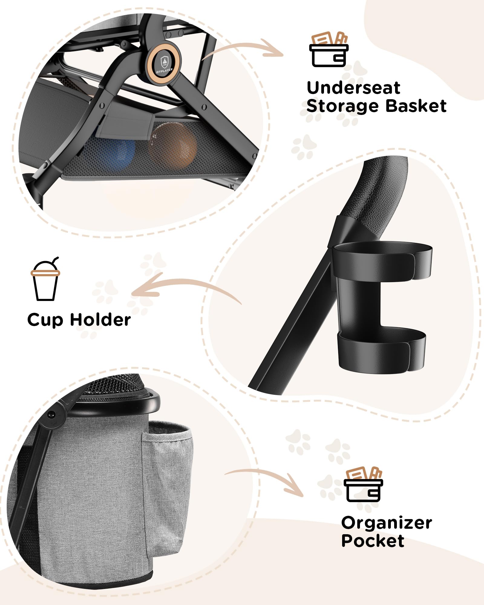 - 【EASY CLEAN COMFORT & SMART STORAGE】:Removable padded mat is waterproof and washable for everyday messes. Under-basket storage keeps essentials organized, and the included cup holder keeps drinks within easy reach for longer walks and day trips.