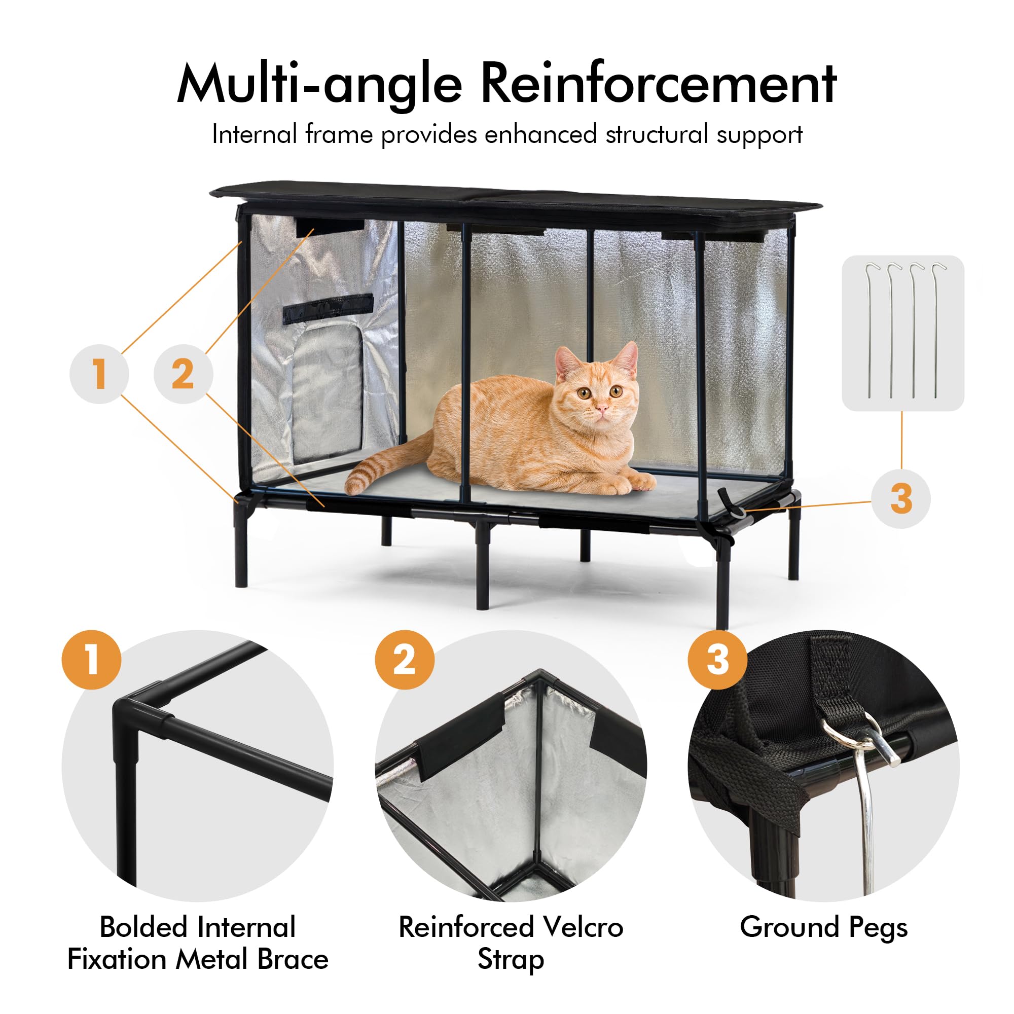 - 【All-Weather Structure & Safety】 Engineered for ultimate protection and peace of mind, our outdoor heated cat house features a smart 2-door escape design—allowing quick exits while keeping wind and rain out. Built with reinforced anti-collapse and strengthened joints, it stands strong against heavy winds and pressure. No peeling, no failing—just unwavering safety and durability.