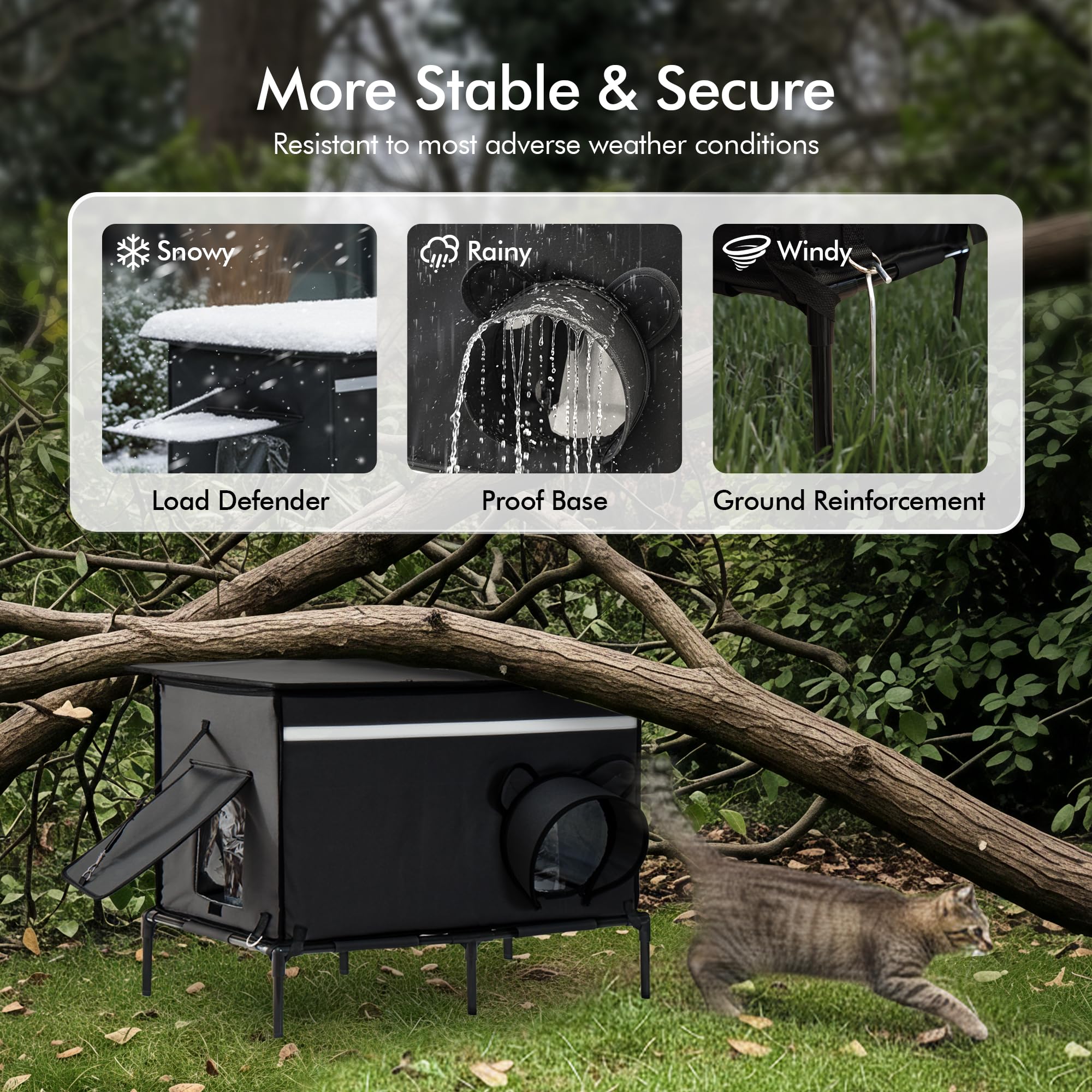 Heated Outdoor cat House for Outside, Weatherproof Insulated Feral Cat Shelter with Timer-Temp Control Heating Pad in Winter, Large Elevated Outdoor Cat House with Zipper, 2 Doors, Safety- Black