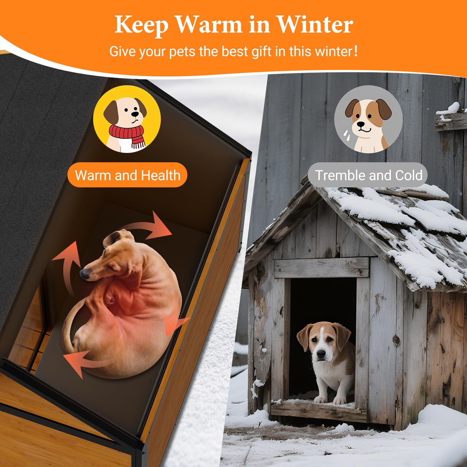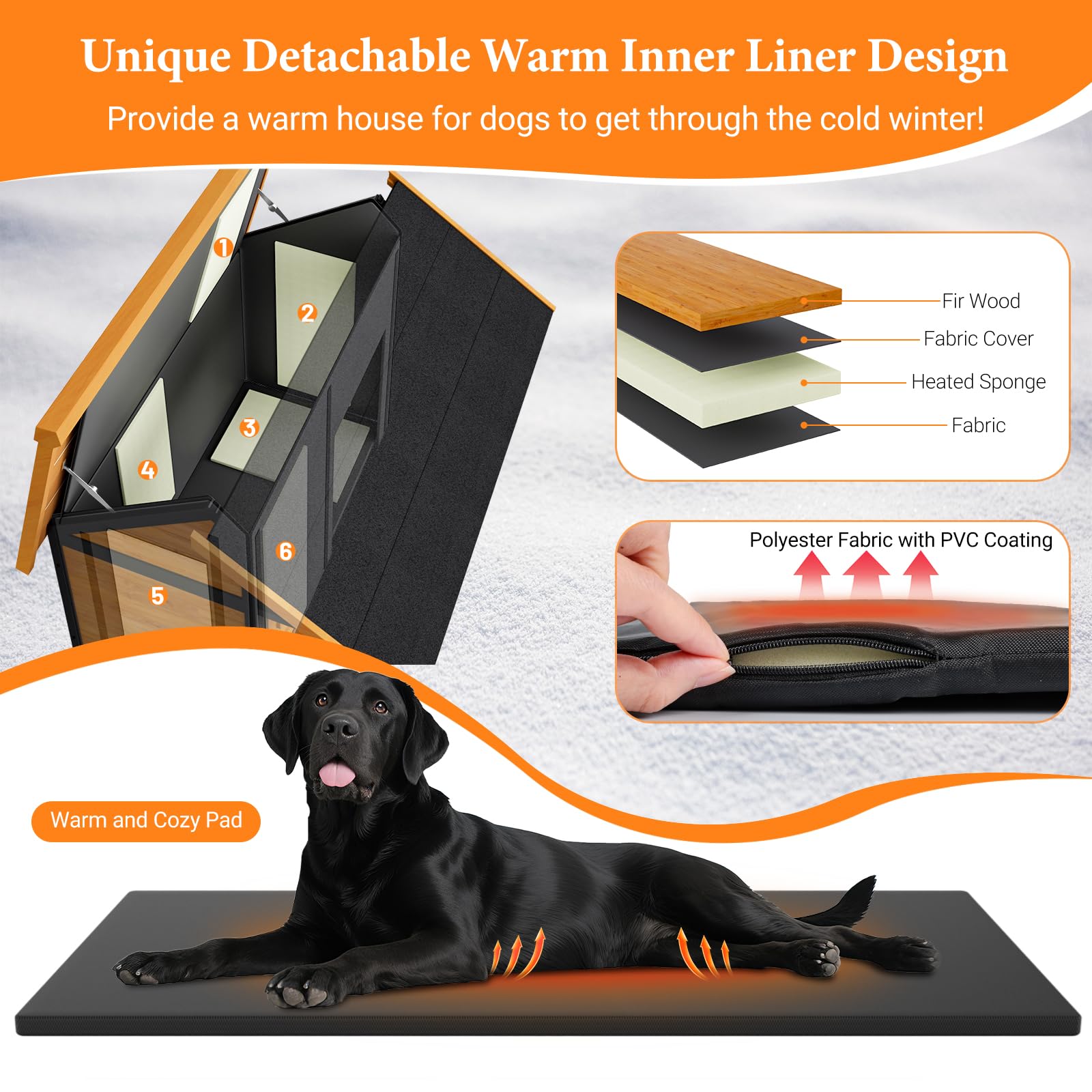 - Unique Insulation Liner Design: This dog house comes with a unque heated liner which is made of high density sponge and fabric with PVC coating. It can help your dogs keep from cold weather hurts, give them a warm house. The liner is easy to attach and also can be remove to machine-washable.