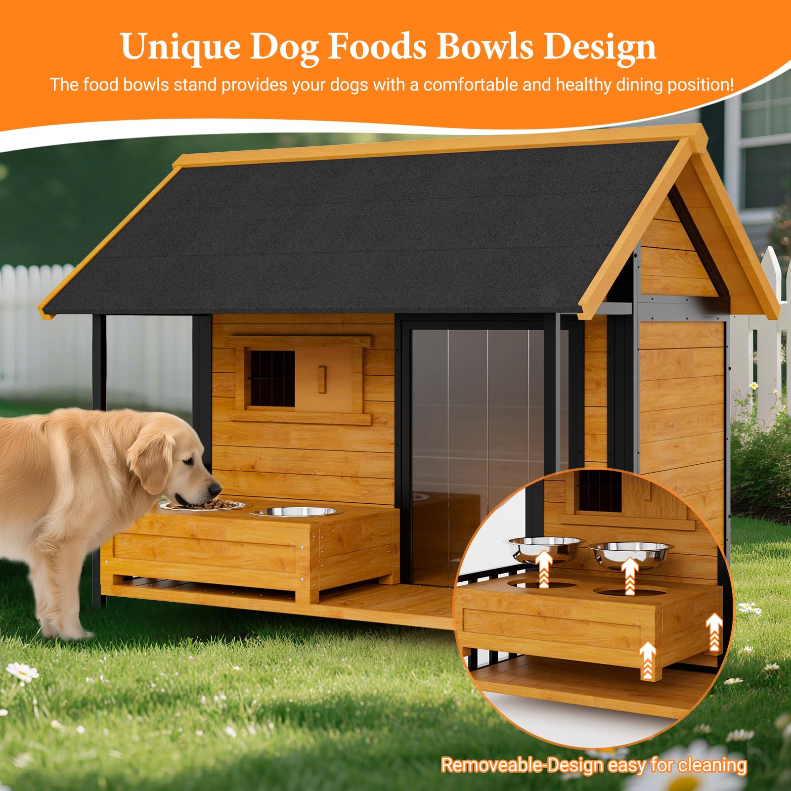 - Dog Bowls Stand Design: Comes with two removable stainless steel bowls and raised stand for convenient, mess-free feeding right at the dog house.