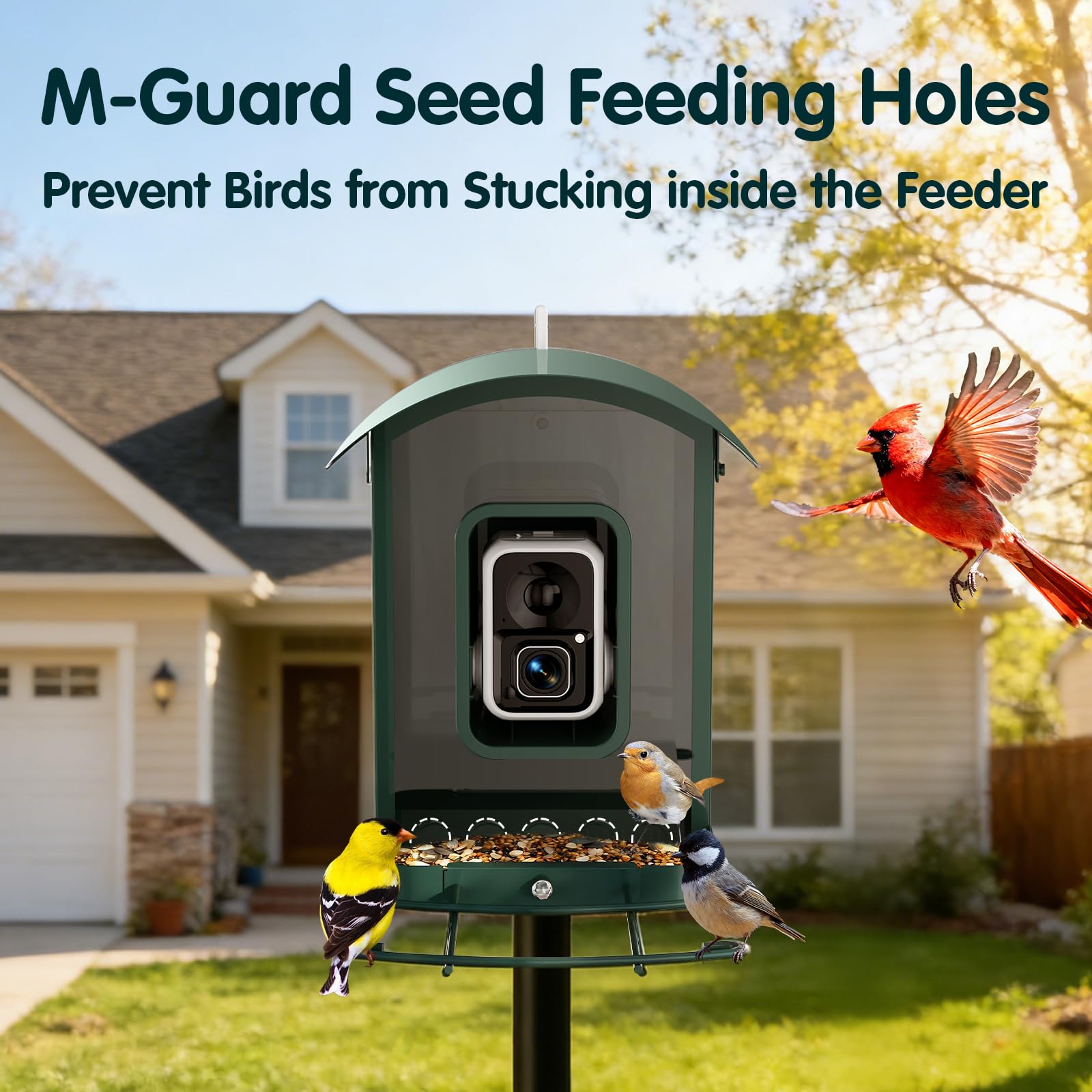 - The Bird Friendly M-Guard Feeding and More Accurate Notification: The M-Guard holes can keep the birds outside of the seed container and reduce the risk of stuck. The accurate bird arriving notification with our AI-enhanced algorithm, combined with advanced PIR motion sensor and Tof technology, will significantly reduce false alerts caused by harsh weather outside. The smart bird feeder will only send notifications to your phone when it detects birds, providing you with true peace of mind