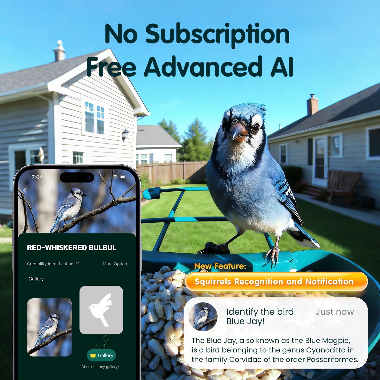 - No Subscription and Free Birds Species Recognition: The Humbirdy bird feeder with camera is designed with our advanced AI technology to identifies over 10,000 bird species. With the built in 32G memory, you can store, share or download any bird videos or photos without subscription needed. Immerse yourself in the fascinating world of birds and enjoy the happy backyard birding