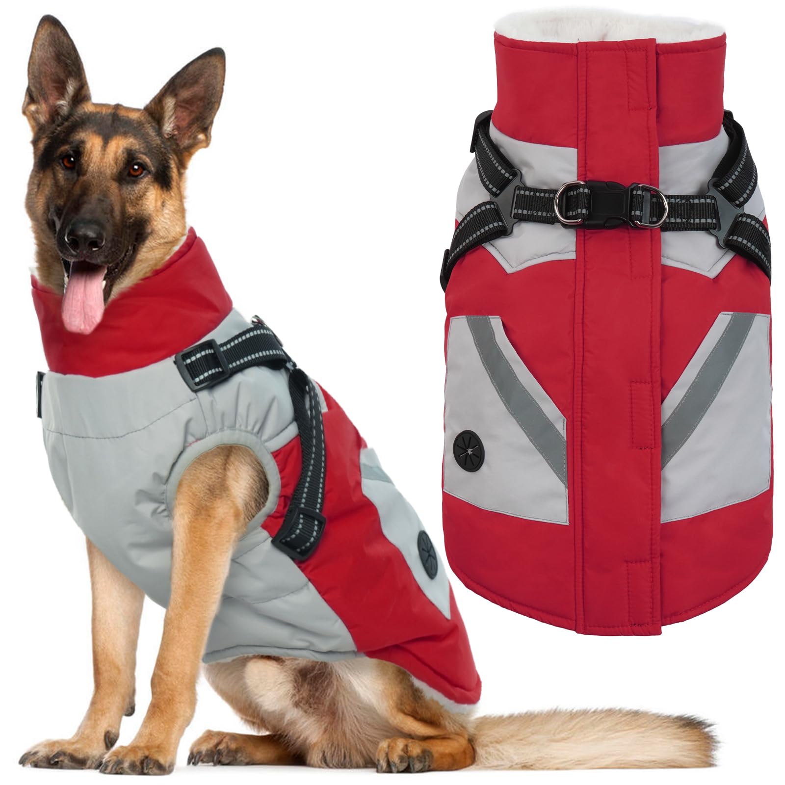 - Dog Winter Coat with Harness:Warm dog coat and dog harness 2 in 1 design,no need extra dog vest harness.Straps are adjustable for a comfortable fit, strengthened seams and sturdy D-ring can withstand strong pulling force from your puppy
