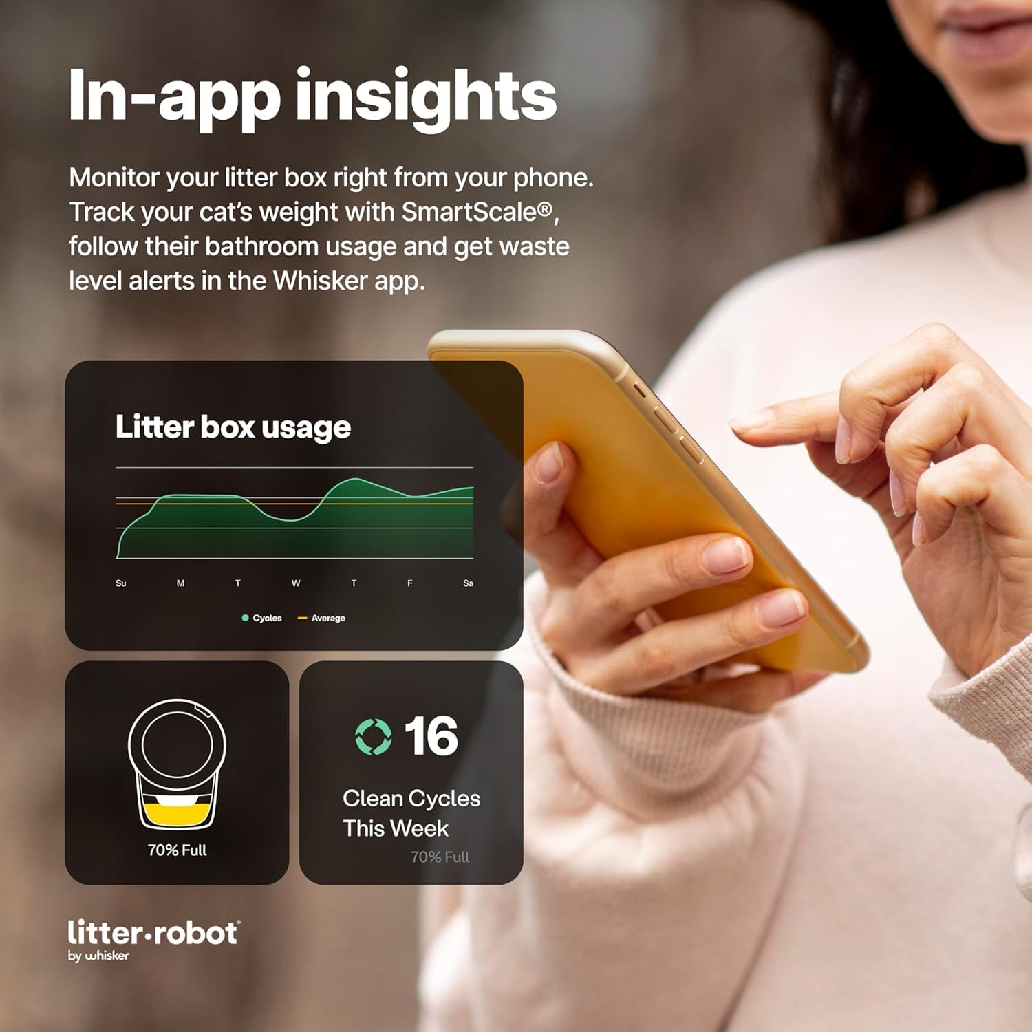 - MONITOR + CONTROL VIA APP: Control the smart litter box straight from the Whisker app. Monitor waste and litter levels in real time, see litter box activity, and track kitty’s weight after each use. Compatible with any clumping litter.