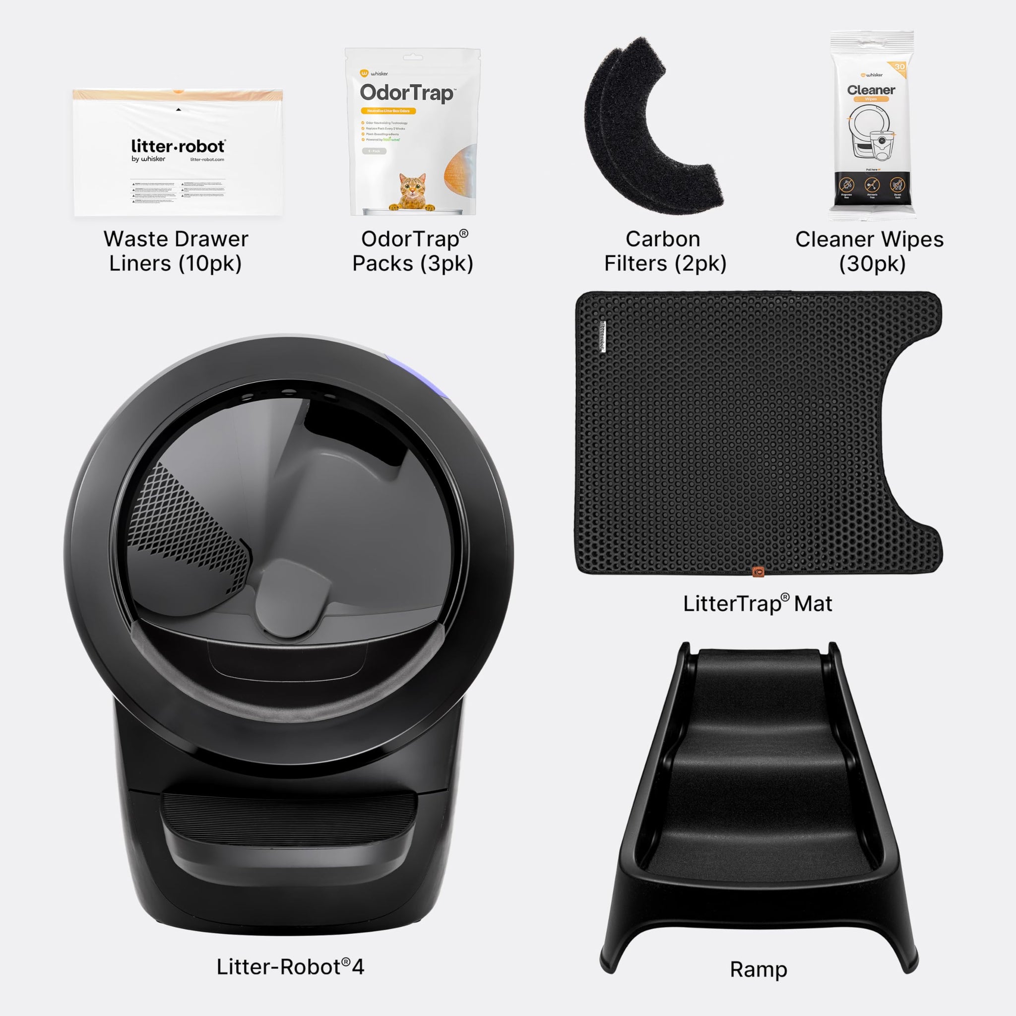 - LITTER-ROBOT CORE BUNDLE: Save on the Litter-Robot 4 Core Bundle, which comes complete with Litter-Robot 4 automatic litter box, 3 OdorTrap refills, 10 waste drawer liners, 30 cleaner wipes, 2 carbon filters, LitterTrap mat, & ramp.