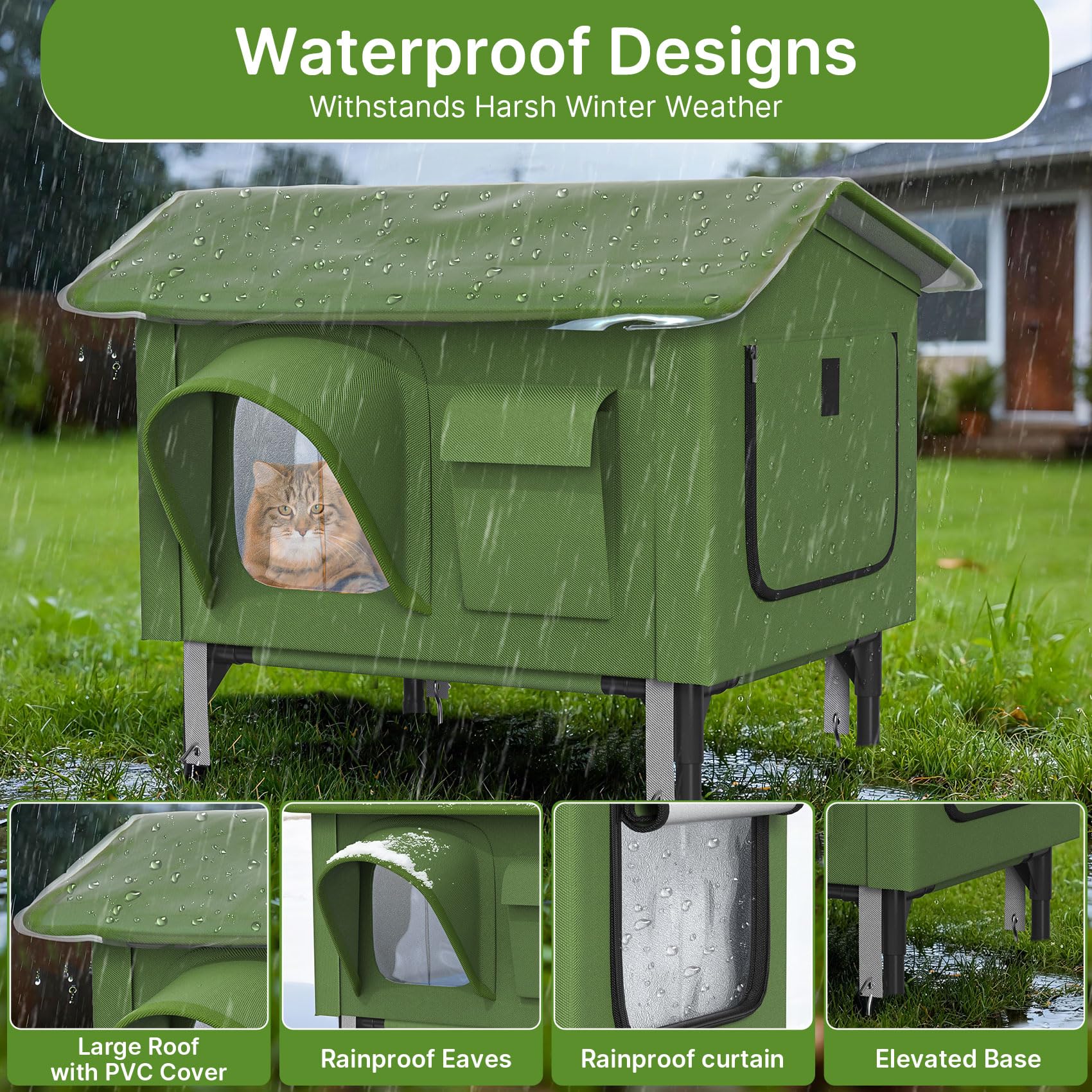 - Safe & Auto-Temp Heating : The outdoor cat house weatherproof includes a waterproof pad that auto-maintains a cozy 86-113°F. It safely shuts off to prevent overheating, offering energy-efficient warmth and complete peace of mind for your pet's comfort outdoors