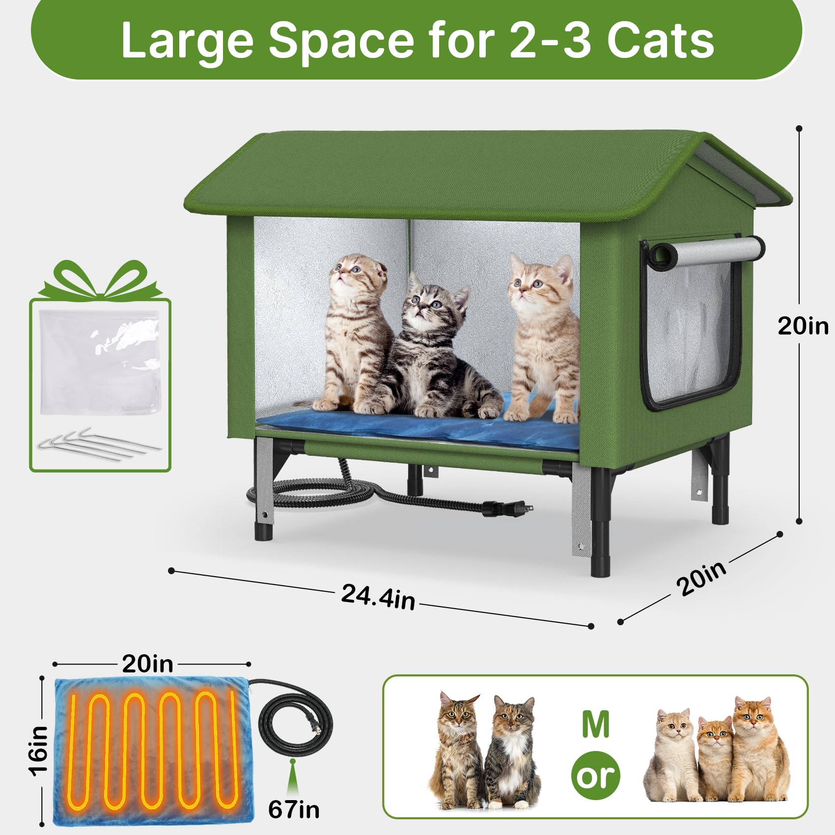 PETIMBER Heated Cat House for Outside - Insulated Outdoor Cat House Weatherproof, Clawsable Feral Cat Shelter with Heated Pad, Escape Doors, Transparent Window, Side Pockets, for Multiple Cats,Large