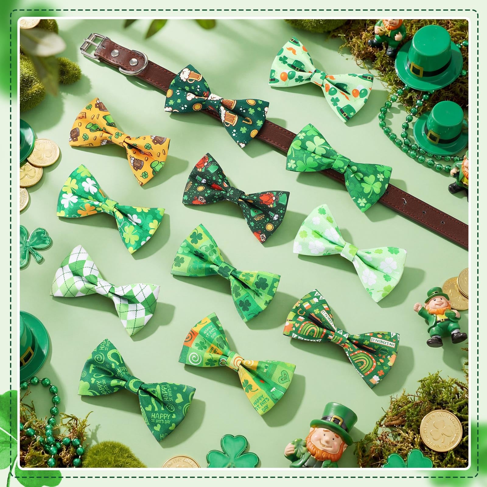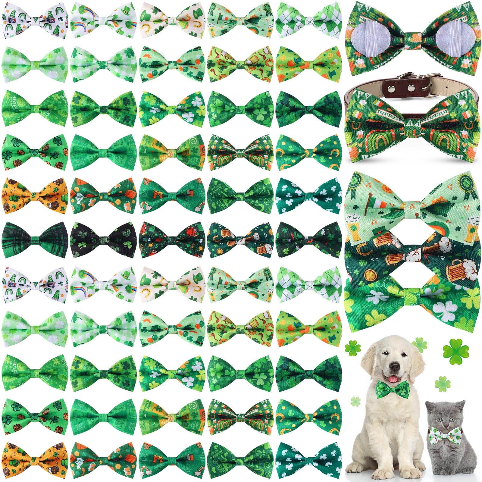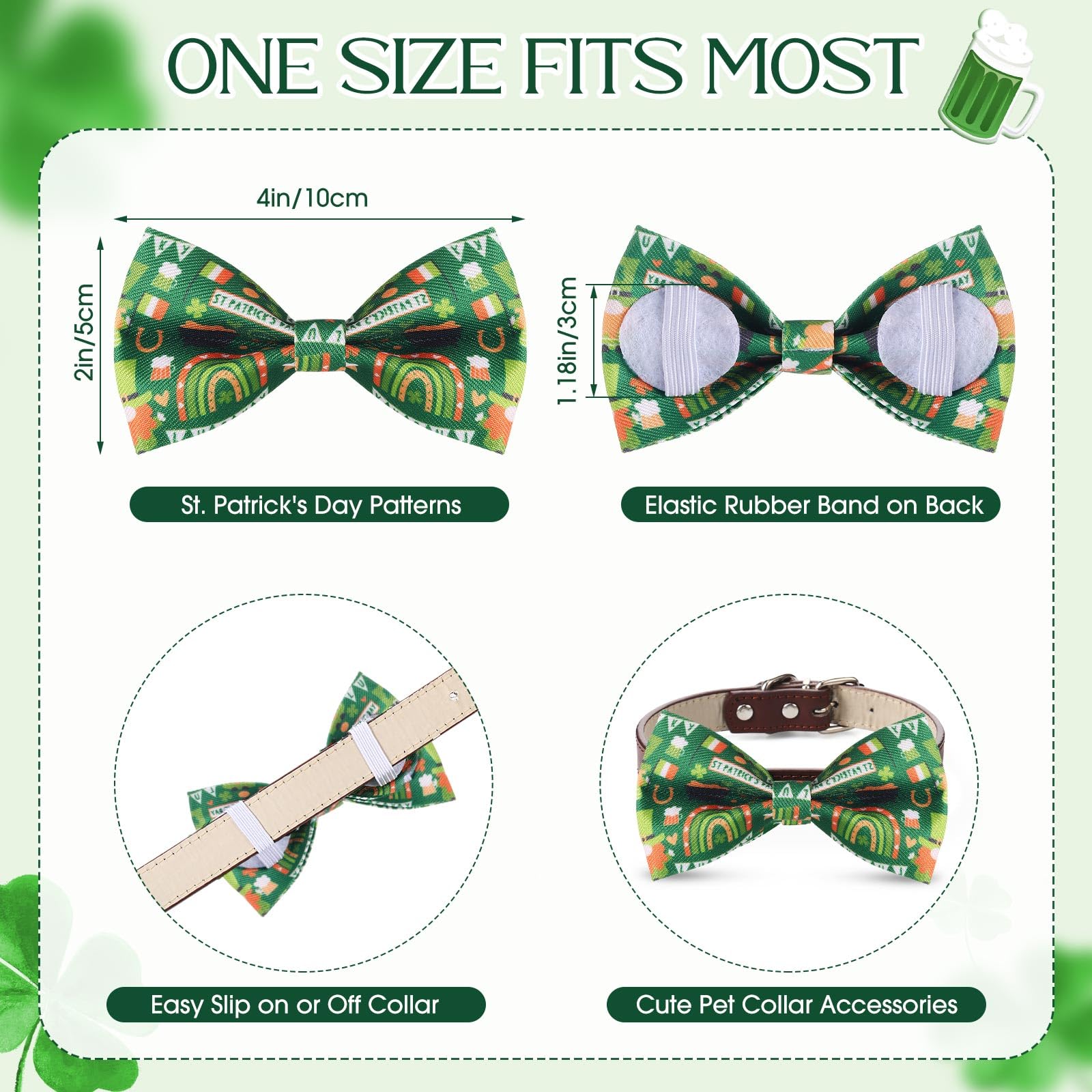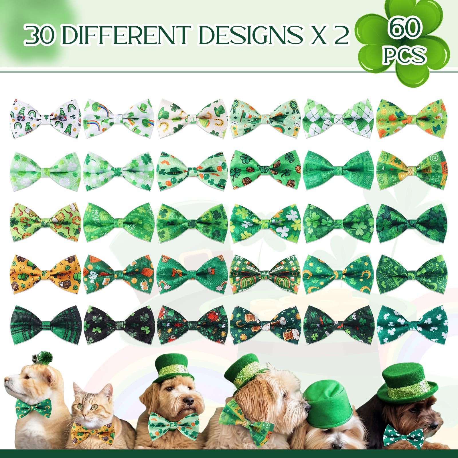 - St. Patrick's Day Themed Design: these dog bows are printed with diverse St. Patrick's Day themed patterns, featuring various seasonal colors and elements, they are cute and will add a lot of charm to your pets during holiday