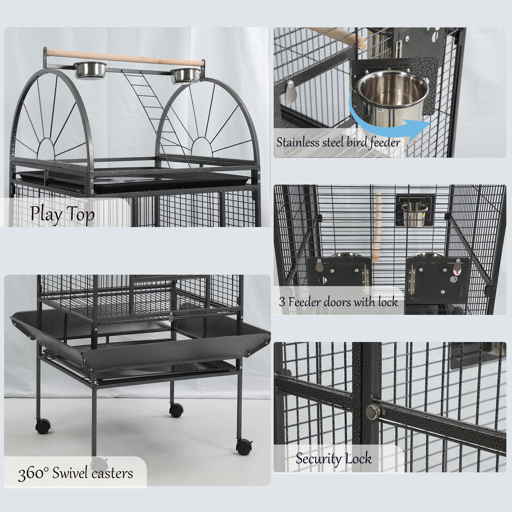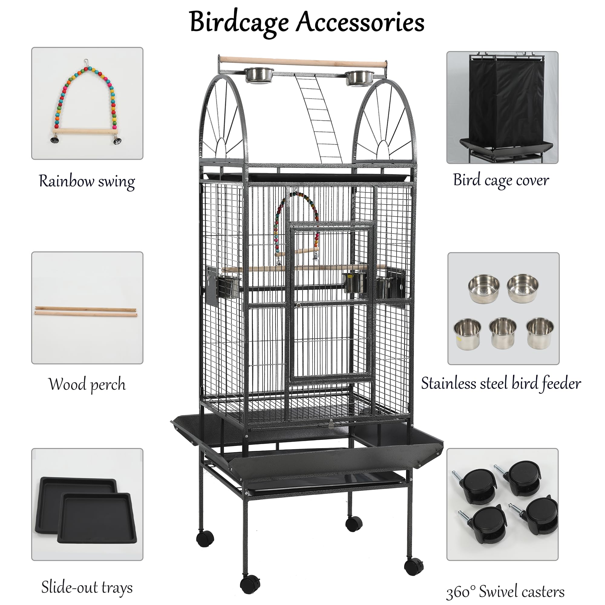 - Thoughtful and practical set includes: 1 parrot cage set, which contains 2 trays, 5 stainless steel feeding cups, 4 casters (2 with braking function), 2 perching wooden sticks, 1 night-time bird cage cover, and 1 toy swing