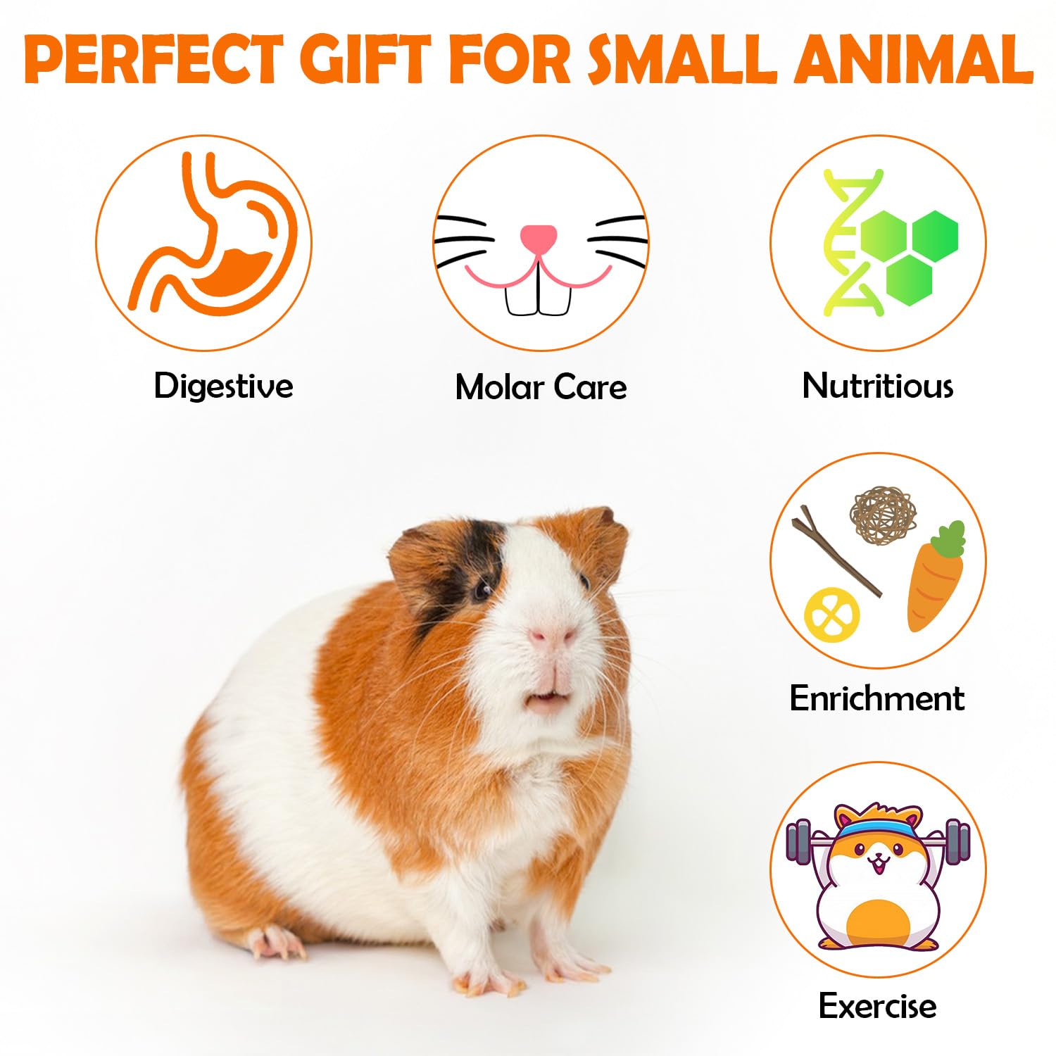 - 10 KINDS OF GUINEA PIG TOYS:The guinea pig cage accessories set includes: 1 guinea pig tunnel(17.7"x5.9"), 1 molar string, 2 rabbit timothy hay cakes, 2 woven carrots, 2 willow balls, 2 mixed grass balls, 2 loofah slices, 2 sweet bamboo sticks, 4 timothy hay sticks, 6 apple sticks. Perfect for guinea pigs, hamsters, ferrets, rats, rabbits, chinchillas, hedgehogs and other small animals.chinchillas, hedgehogs and other small animals.