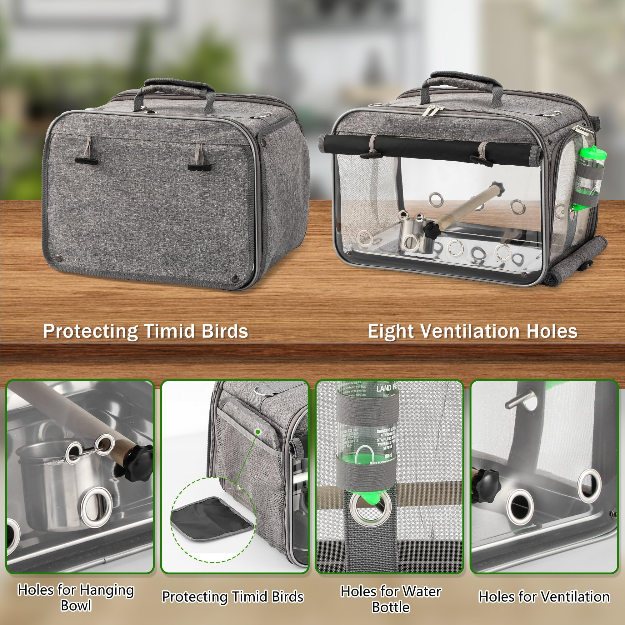 - 【FEEDING & PERCHING】There are a removable bowl, a water bottle and a perch come with the bird carrier. It provides a comprehensive care and comfortable environment for birds even in a long travel.
