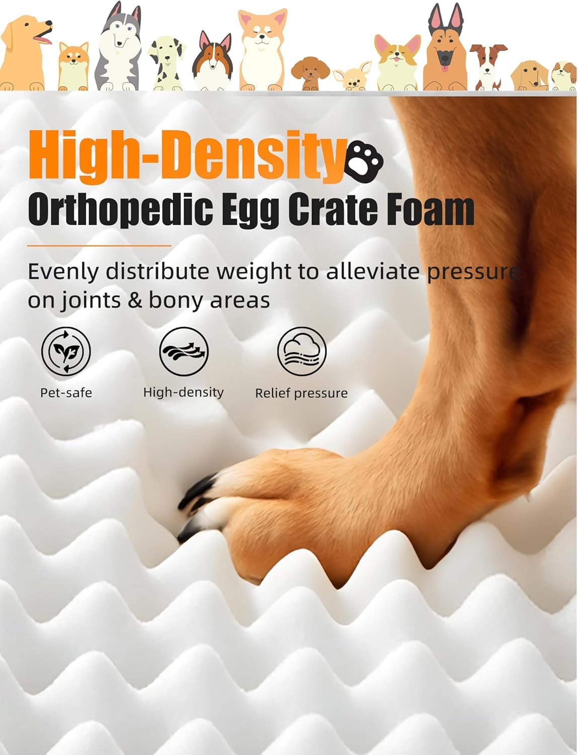 - š¶ćOrthopedic Comfort & SupportćHigh-density egg crate orthopedic foam relieves joint pain and supports large breeds, seniors, and dogs with arthritis. Soft, season-proof Dutch velvet cover and a non-slip bottom keep the bed comfortable and secure.